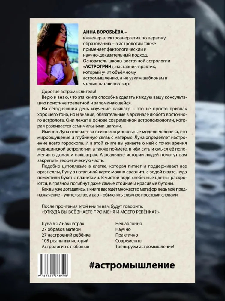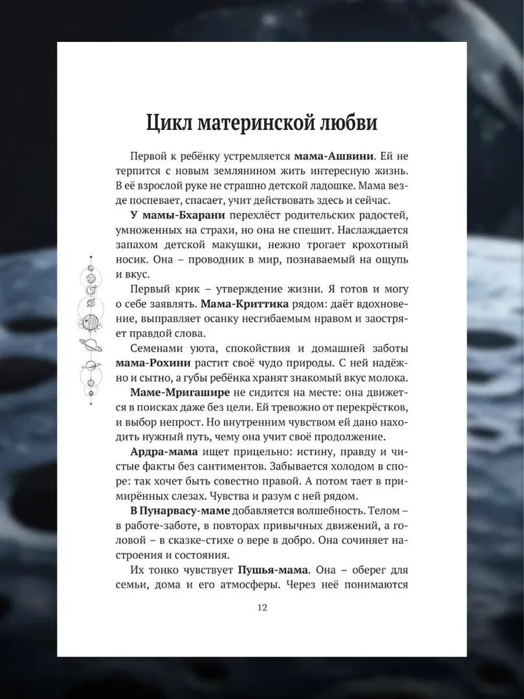 Автор книги приглашает читателей познакомиться с Луной в восточной астрологии и тем, как её положение в натальной карте влияет на образ главного человека, с которым каждый на Земле был связан крепкой пуповиной — Мамы. Книга написана доступным языком и наполнена реальными историями, которые делают её трогательной и живой. Полученные знания сделают ваши семейные консультации более красочными, а астрологические рекомендации бережными и действенными. Это не просто учебник, а тренажёр астромышления и интуитивного восприятия гороскопа. |