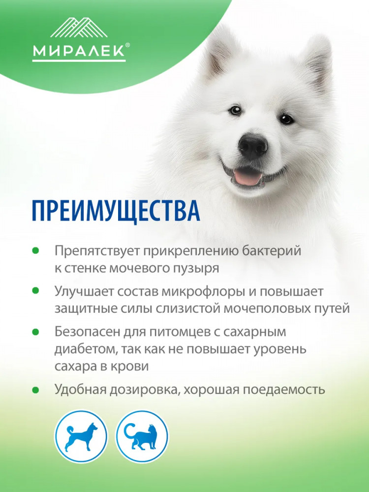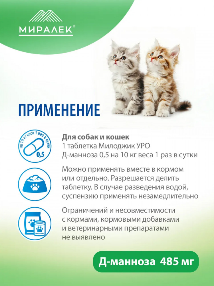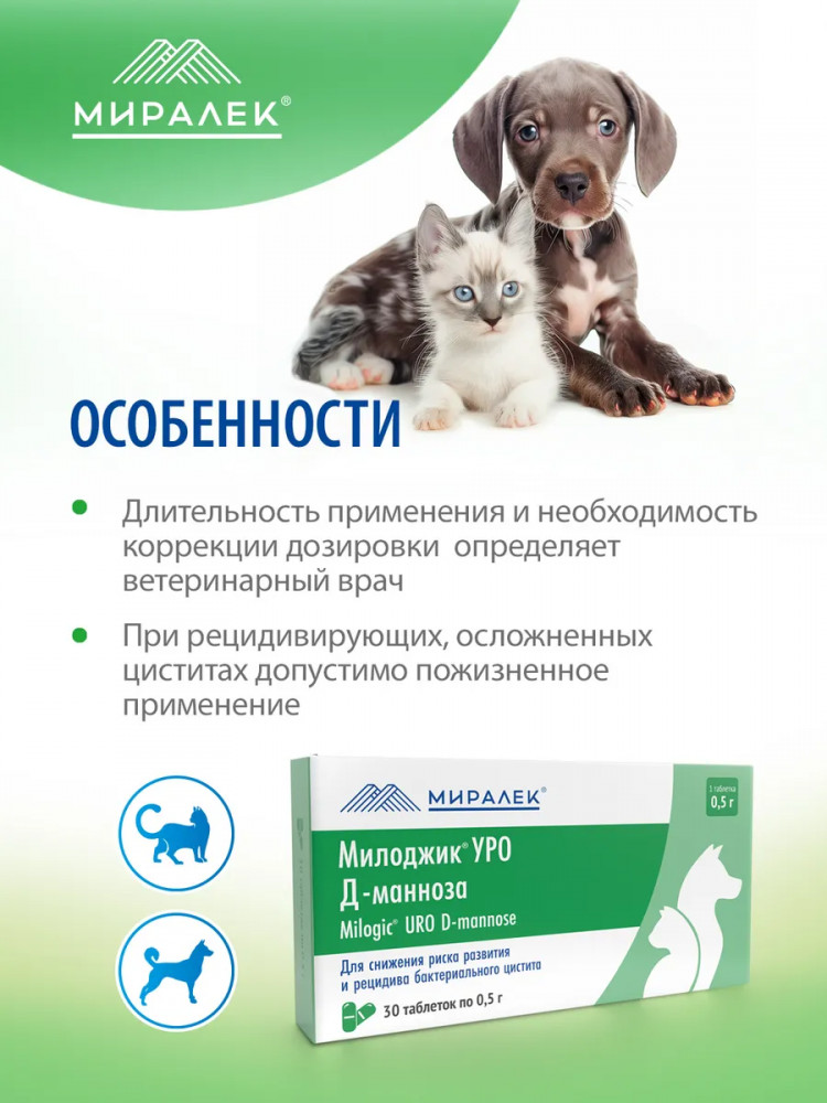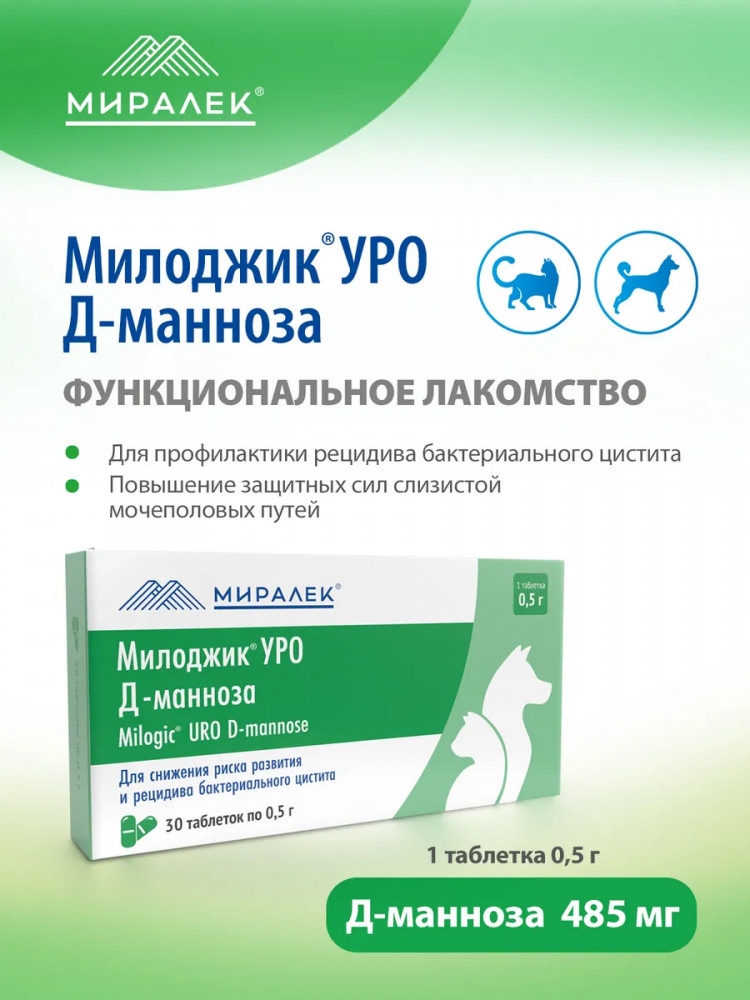 Миралек Лакомство функциональное для снижения риска развития и рецидива бактериального цистита у собак и кошек «Милоджик Уро Д-манноза»новинка В данный момент этот товар отсутствует в продаже. Возможно, у нас найдется аналогичный или похожий товар здесь. Функциональное лакомство Милоджик Уро Д-манноза помогает предотвратить развитие бактериального цистита и улучшить состояние мочевого пузыря. Благодаря воздействию Д-маннозы бактерии, вызывающие цистит, теряют подвижность и патогенность. При этом полезная микрофлора не страдает. Более того, Милоджик УРО с Д-маннозой способствует росту полезных молочнокислых бактерий. Милоджик УРО безопасно для пациентов с сахарным диабетом, так как не повышает уровень сахара в крови. Милоджик УРО с Д-маннозой можно назначать при рецидивирующем и спорадическом цистите, при бессимптомной бактурии. |