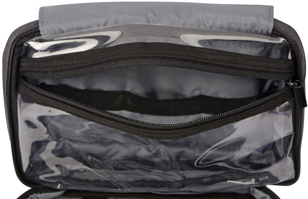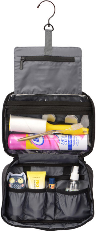 Несессер раскладывается как книжка на две створки и дополнительную секцию с металлическим крючком для подвешивания, карманом на молнии и фиксирующей резинкой. Металлический крючок позволяет подвешивать полностью заполненный несессер, поскольку способен выдержать большой вес, кроме того, вешалка проворачивается вокруг своей оси, что позволяет использовать эту модель с рейлами или в шкафу. Центральная секция имеет прозрачное большое отделение на молнии из ПВХ, внутри которого — три фиксирующих резинки для флаконов или иных принадлежностей. Благодаря выбранному материалу это отделение легко можно протереть влажной салфеткой, если содержимое бутылочки с шампунем или иной косметикой протекло. Вторая створка состоит из большого плоского кармана на молнии, двух резинок, которые подойдут для фиксации зубной щетки, двух узких и двух квадратных карманов. Имеет наружный карман на молнии. Материал несессера позволяет легко споласкивать его при необходимости, ткань быстро высыхает.