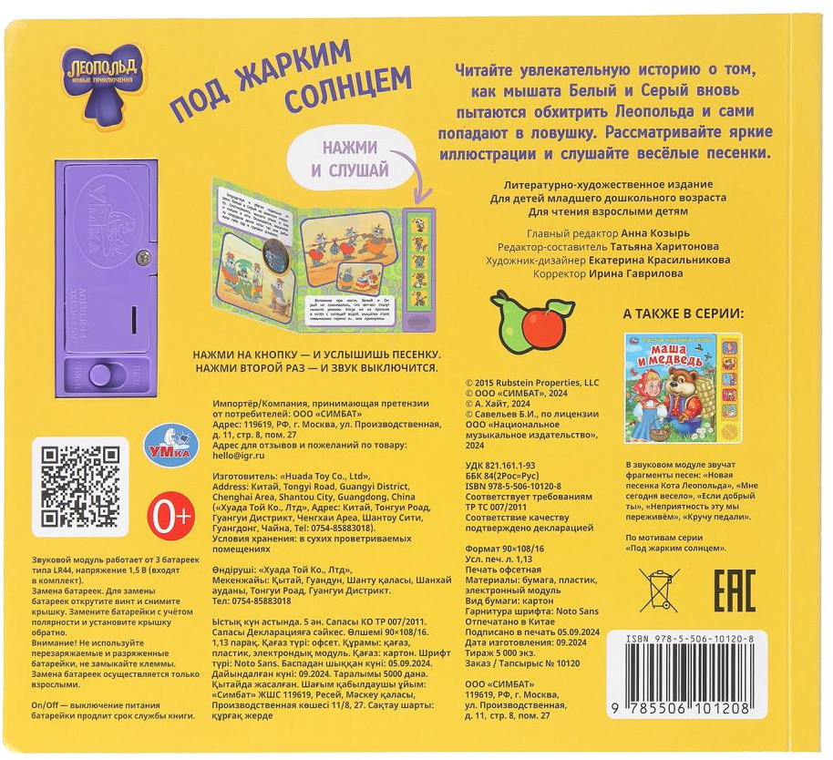 💳 Оплатить за товар можно при получении 🇰🇿 Есть бесплатная доставка по Казахстану 🎁 Копите бонусы с каждой покупки Музыкальная книга «Леопольд. Под жарким солнцем» ТМ «УМка» станет прекрасным подарком для ребёнка. Ребёнок с удовольствием будет листать плотные картонные страницы, рассматривать красочные картинки, читать вместе с родителями про приключения доброго кота Леопольда и двух мышек-хулиганов, а также нажимать на кнопку и слушать песенки из любимого м/ф. Ребёнок легко освоит включение звука: по нажатию на кнопку звук включится, при втором нажатии выключится. Книжка сделана из плотного картона, поэтому родители могут не опасаться за её сохранность. Благодаря компактному формату её удобно брать с собой. |