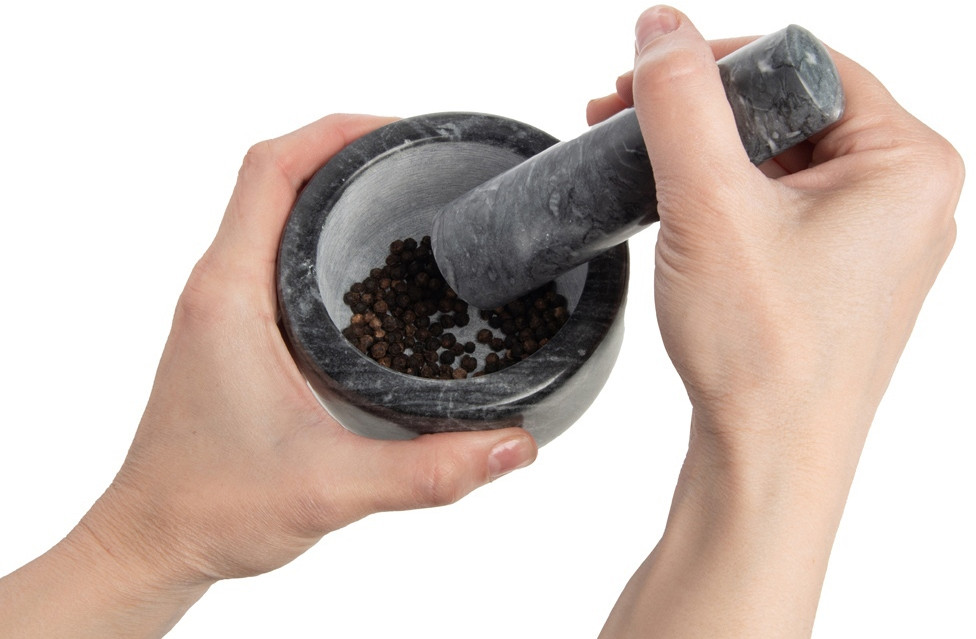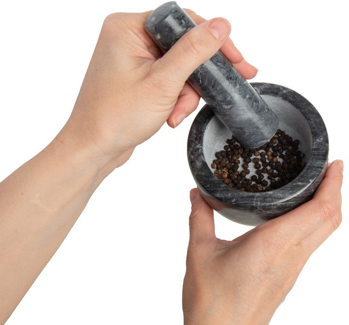 Ступка из натурального мрамора «Pesto» — по-настоящему благородное дополнение вашей кухни, которое не только украсит ее, но и пригодится при готовке. Материал не впитывает запахи, легко моется, имеет приятную текстуру и выглядит действительно достойно. Поставляется в комплекте с пестиком, удобным для обхвата ладонью. Пользоваться ступкой приятно даже просто с точки зрения тактильности, превращая процесс приготовления блюда в почти медитативную практику. Ступка 10.5×10.5×7.5 см, пестик 3.3×3.3×12 см. |