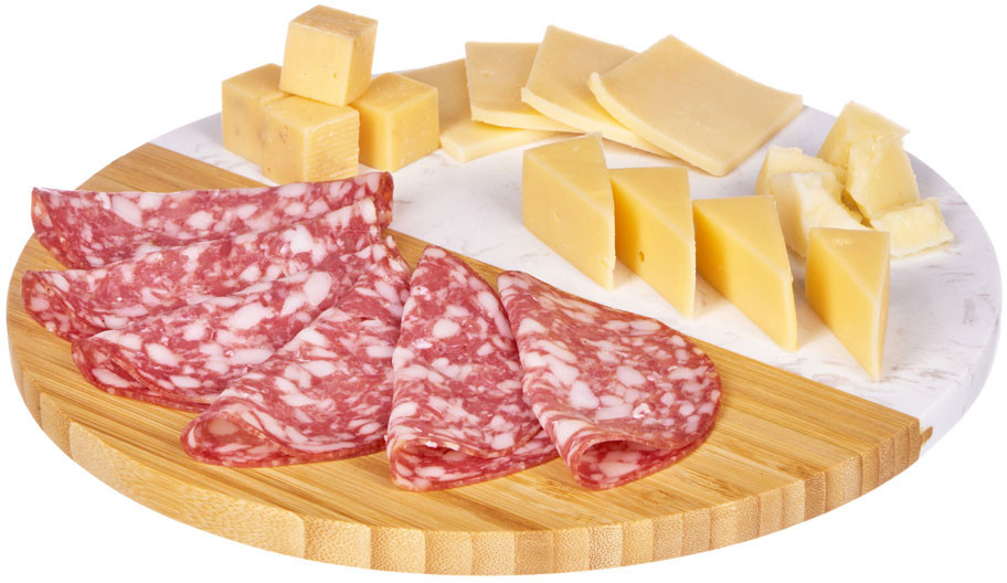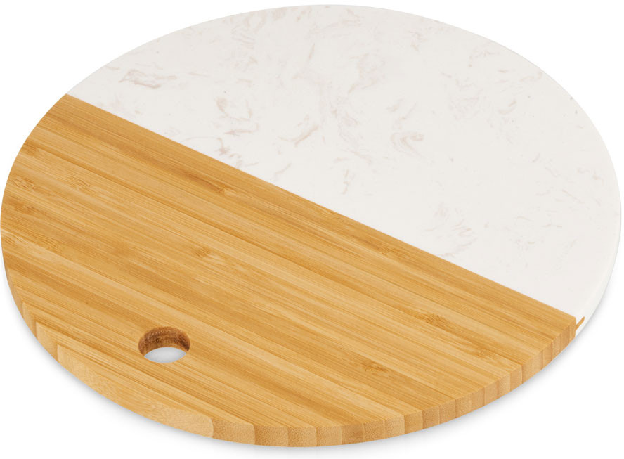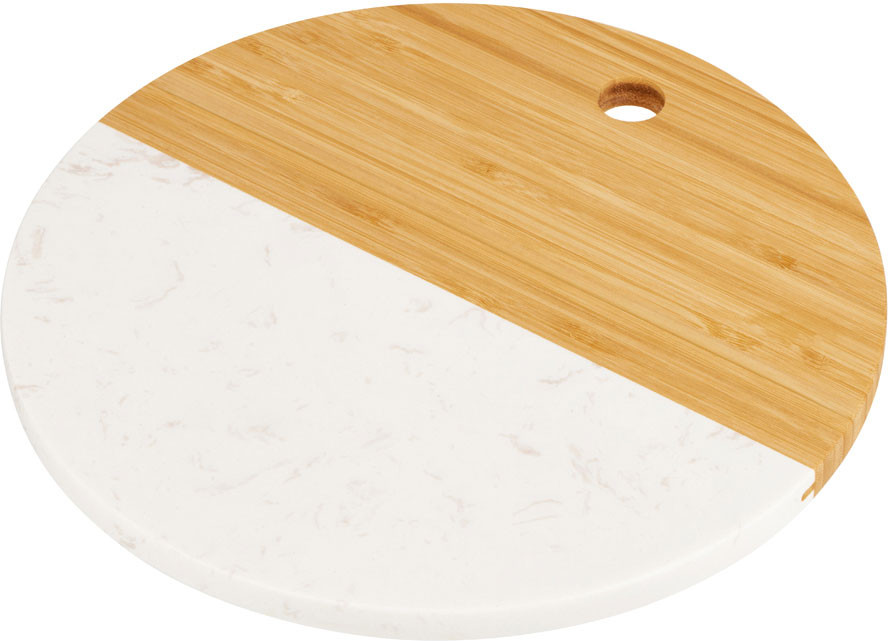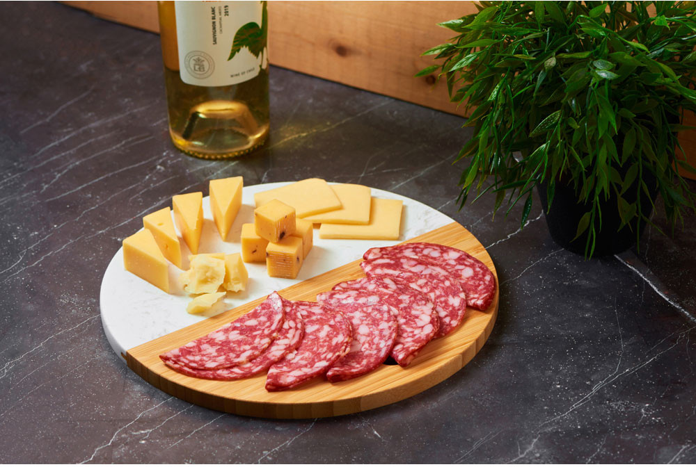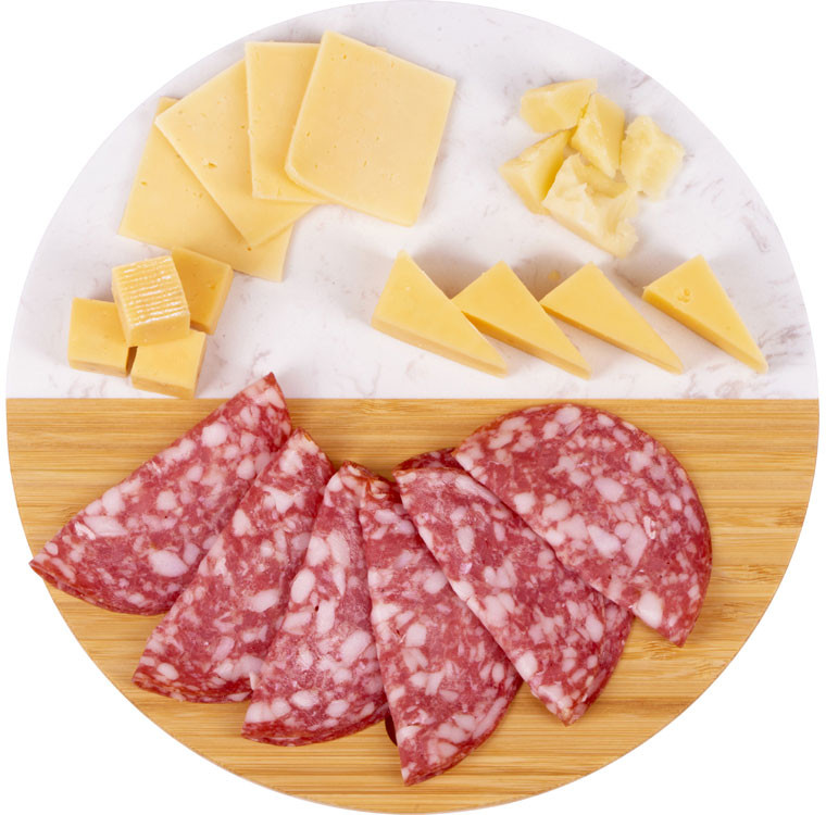 Разделочная доска от Eat&Bite состоит наполовину из бамбука, а вторая половина выполнена из мрамора. Это позволяет не только использовать доску для разделки, но и оригинально подать закуски, сыры или нарезки, зонируя виды снеков.
