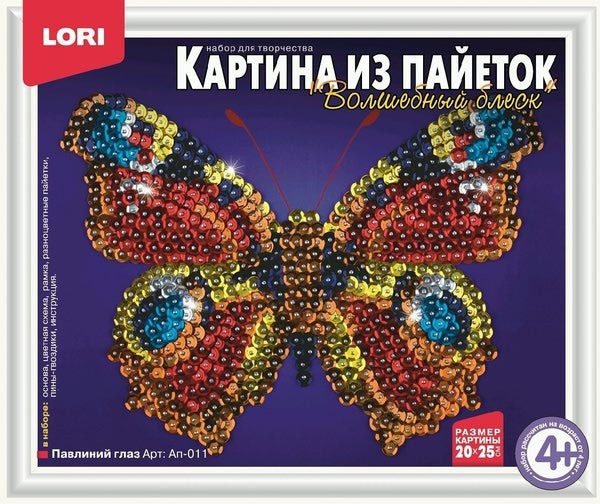 Набор для всех всех детей, которые любят заниматься творчеством, создавая своими руками новые поделки из пайеток. Набор предлагает изготовить картину с изображением бабочки из разноцветных пайеток на цветной основе. Готовая картина может стать украшением для комнаты или замечательным подарком для близкого человека.