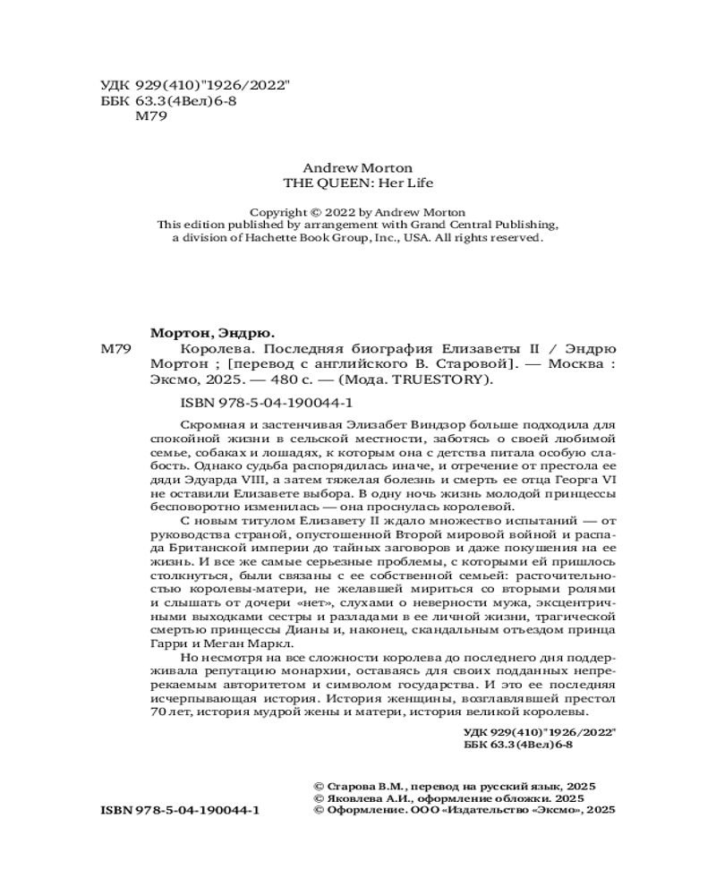 💳 Оплатить за товар можно при получении 🇰🇿 Есть бесплатная доставка по Казахстану от 1 дня 🎁 Копите бонусы с каждой покупки Серия: Мода. Truestory 8 сентября 2022 года не стало одного из самых долгоправящих монархов в истории Великобритании Елизаветы II. За 70 лет пребывания на троне ей пришлось пройти множество испытаний, включая многочисленные скандалы, сотрясавшие королевскую семью в разные годы, но она бесспорно оставила глубокий след в истории, став одним из самых узнаваемых и уважаемых мировых лидеров наших дней, символом своего государства и непререкаемым авторитетом для своего народа. |