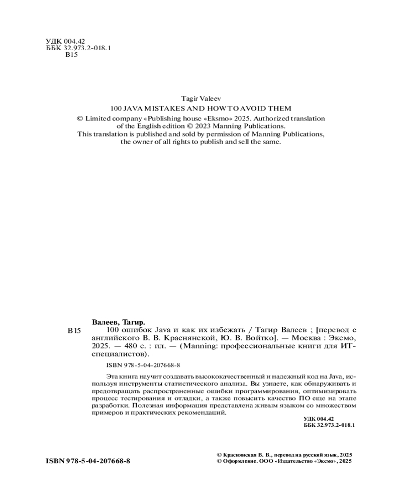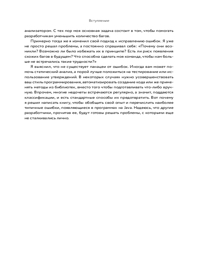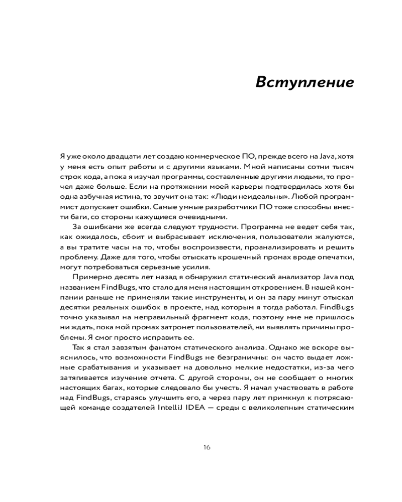 Серия: Manning: профессиональные книги для ИТ-специалистов Надежный код на Java с помощью инструментов статического анализа. Даже небольшие ошибки при разработке могут стать серьезными проблемами в эксплуатации продукта. Лучше выявлять и исправлять их до того, как они приведут к серьезным последствиям! Прольем свет на самые частые баги и покажем, как их избежать, что надо сделать для распознавания ошибок и антипаттернов, как провести эффективную отладку и тестирование. |
