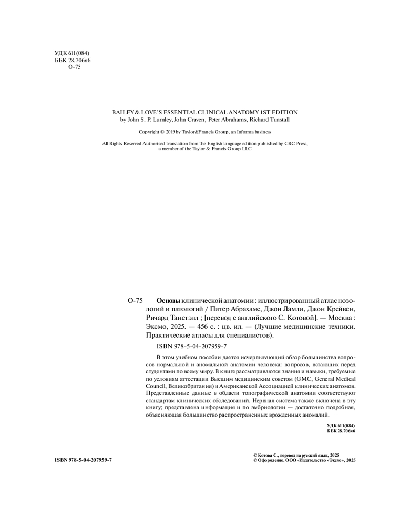 💳 Оплатить за товар можно при получении 🇰🇿 Есть бесплатная доставка по Казахстану 🎁 Копите бонусы с каждой покупки Серия: Лучшие медицинские техники. Практические атласы для специалистов «Основы клинической анатомии» охватывают современные учебные программы, требуемые большинством регулирующих медицинских инстанций по всему миру, и, следовательно, содержат необходимую информацию для проведения соответствующих обследований. |