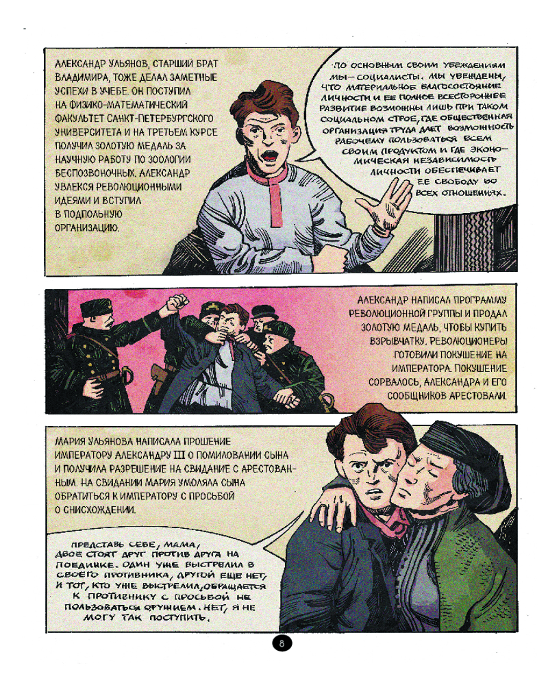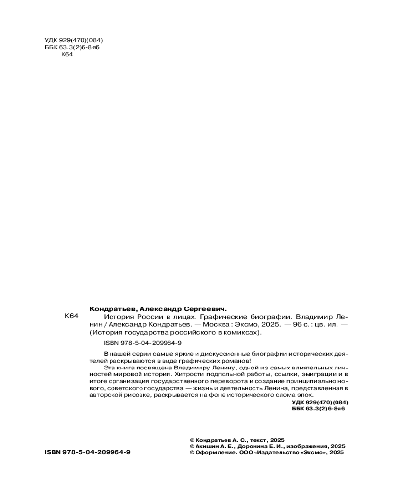 Серия: История государства российского в комиксах Это нон-фикшен-комикс для тех, кто не ищет простых ответов о главном революционере XX века. История жизни Владимира Ленина — это история о том, как целеустремленность, стратегический ум и несгибаемая воля одного человека повернули ход всей истории. О том, как идеи, рожденные в тишине библиотек и в жарких спорах с политическими оппонентами, смогли уничтожить, казалось бы, незыблемую империю и создать новую реальность. |