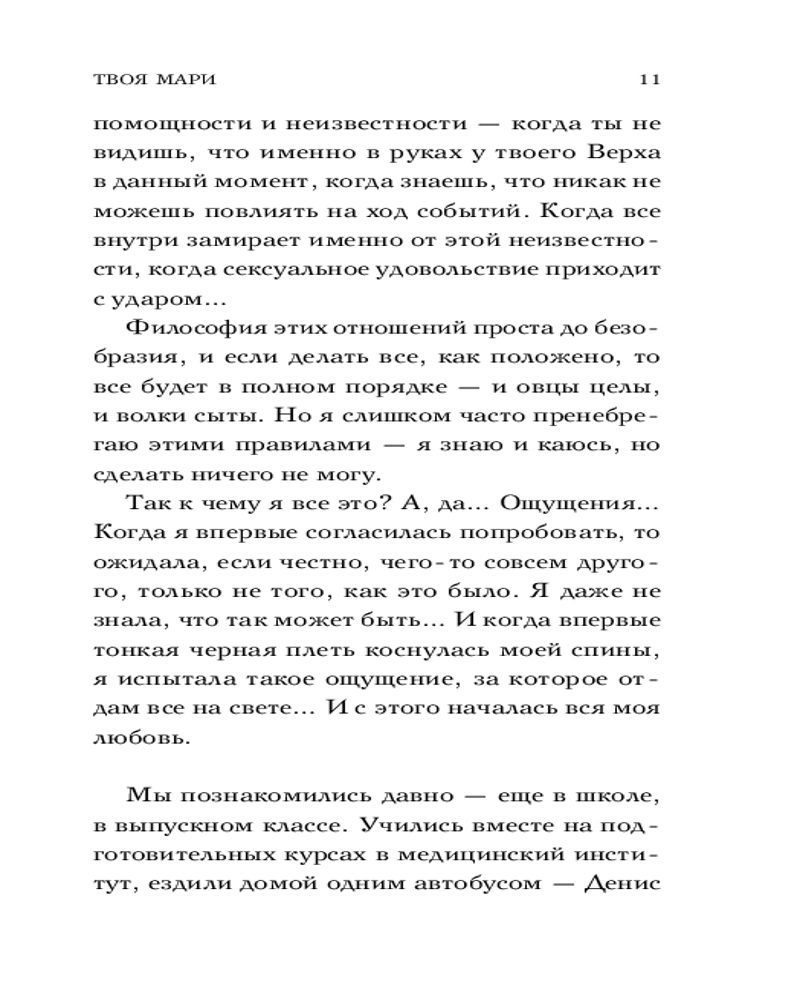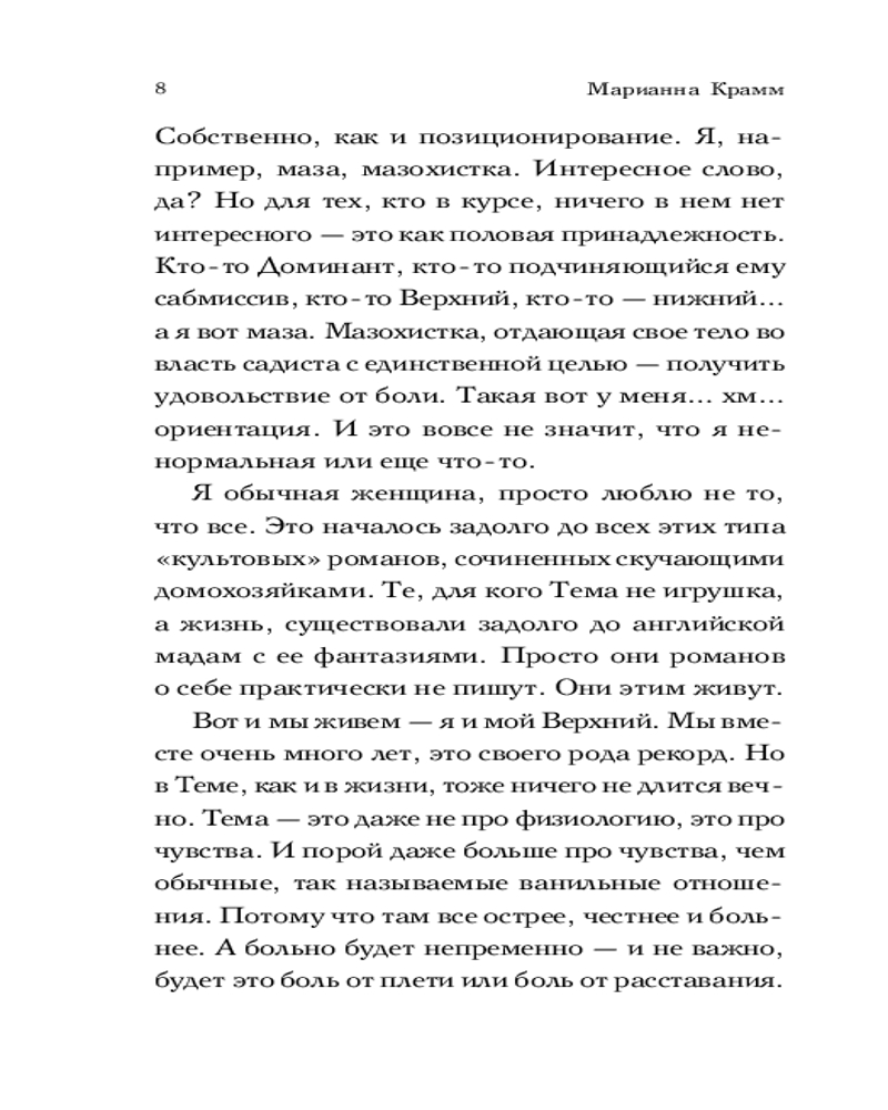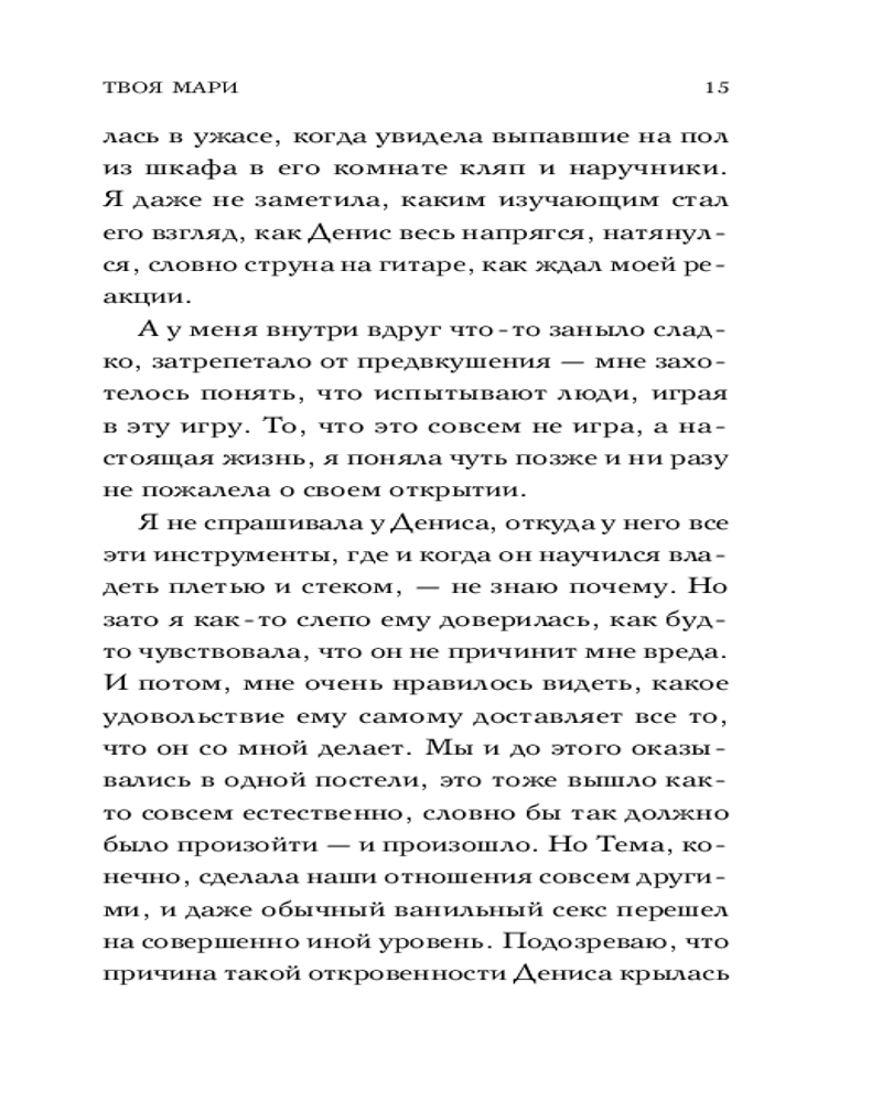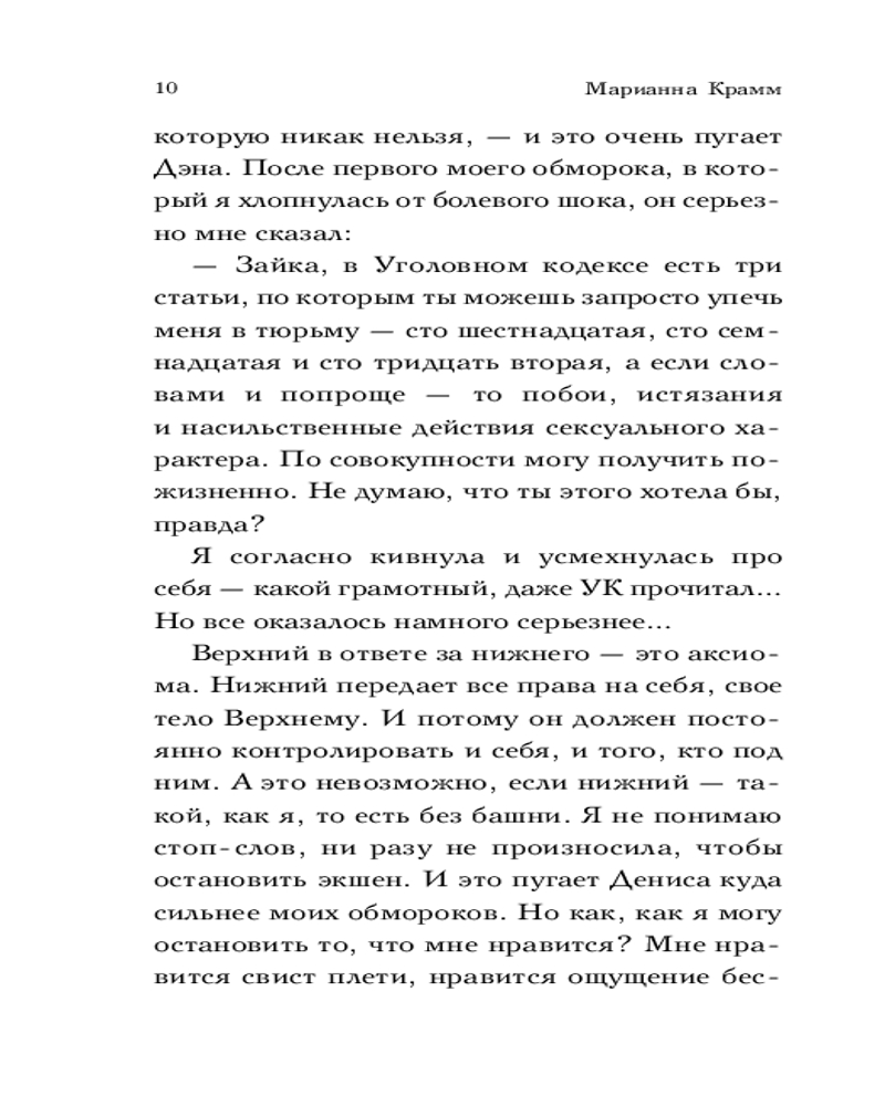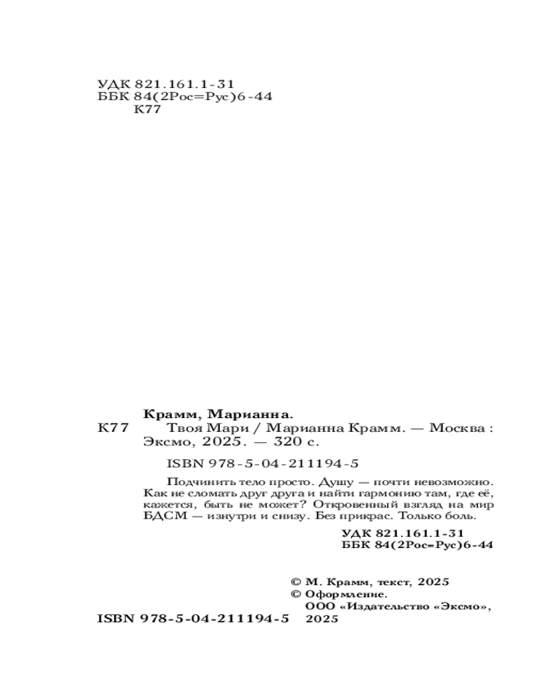 💳 Оплатить за товар можно при получении 🇰🇿 Есть бесплатная доставка по Казахстану 🎁 Копите бонусы с каждой покупки Серия: Страсть сильнее правил. Чувственные романы Марианны Крамм Подчинить тело просто. Душу — почти невозможно. Как не сломать друг друга и найти гармонию там, где ее, кажется, быть не может? Откровенный взгляд на мир БДСМ — изнутри и снизу. Без прикрас. Только боль. |