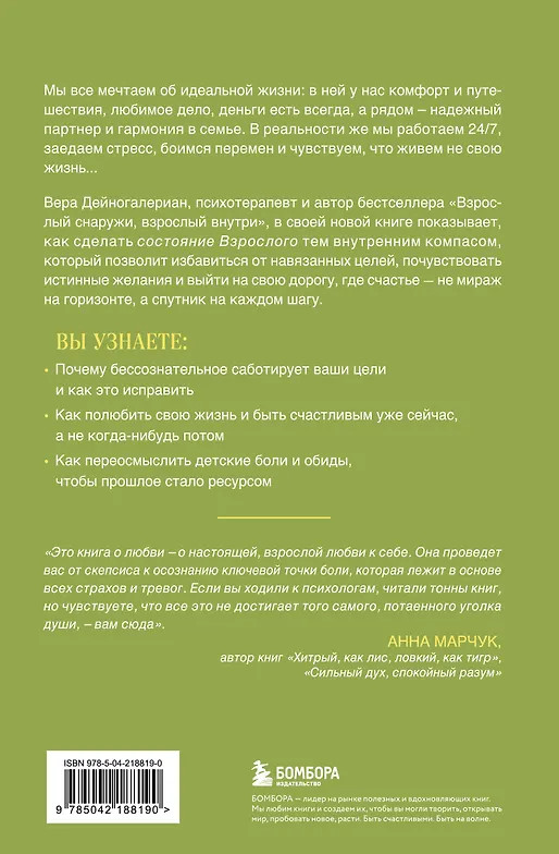 💳 Оплатить за товар можно при получении 🇰🇿 Есть бесплатная доставка по Казахстану от 1 дня 🎁 Копите бонусы с каждой покупки Серия: Работа над собой. Книги сильных психологов Мы все мечтаем об идеальной жизни: в ней у нас комфорт и путешествия, любимое дело, деньги есть всегда, а рядом — надежный партнер и гармония в семье. В реальности же мы работаем 24/7, заедаем стресс, боимся перемен и чувствуем, что живем не свою жизнь... |