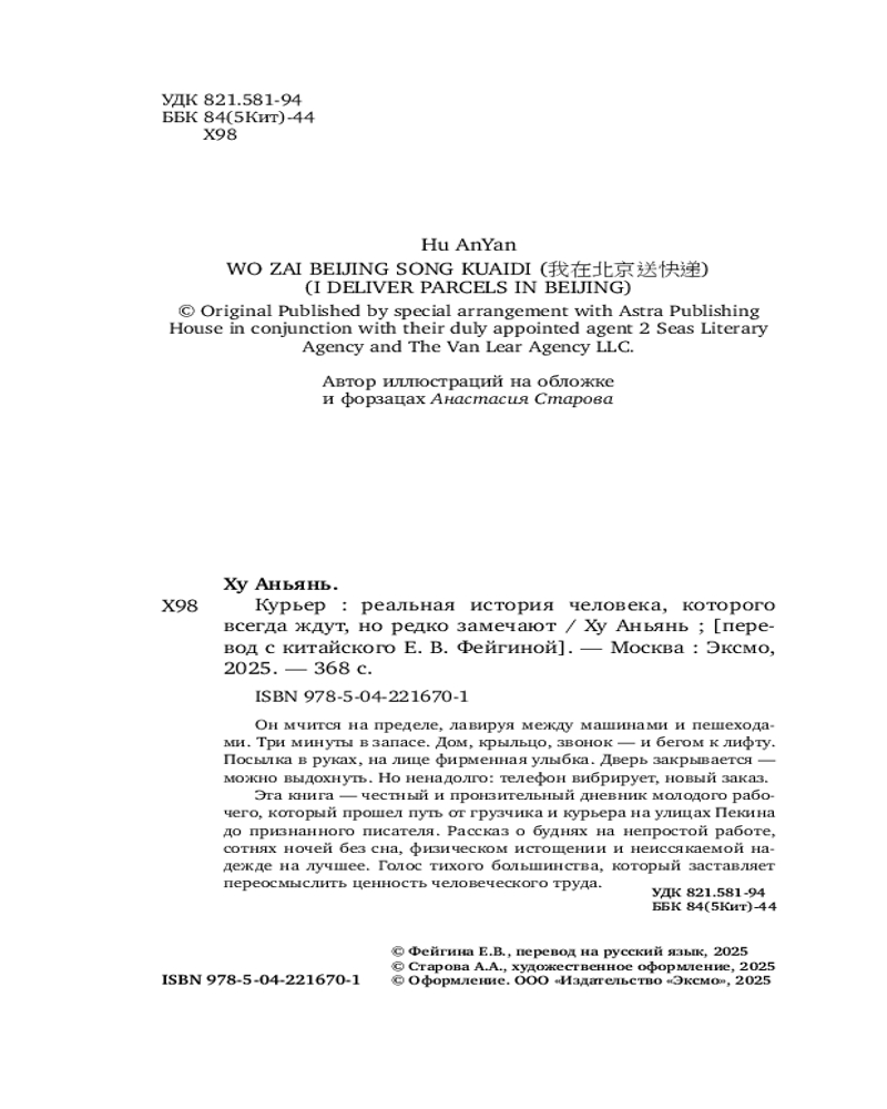 Серия: Тайная жизнь городов. Истории тех, кто обычно молчит От грузчика на складе и курьера на улицах Пекина до признанного писателя. Он вырос в простой семье и рано столкнулся с необходимостью зарабатывать на жизнь самостоятельно. Его желания скромны: выспаться, не испытывать постоянного голода, не мучиться от жары и шума. Это рассказ о выживании, борьбе с обстоятельствами и скромных мечтах обычного человека, который хочет просто жить чуть лучше, чем вчера. |