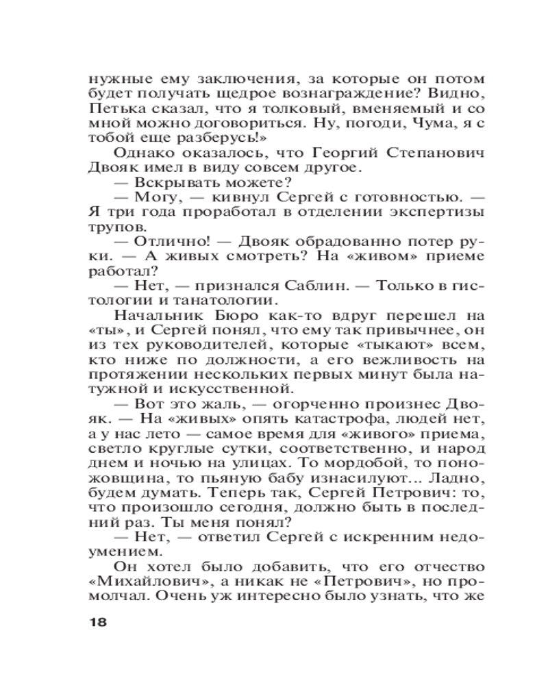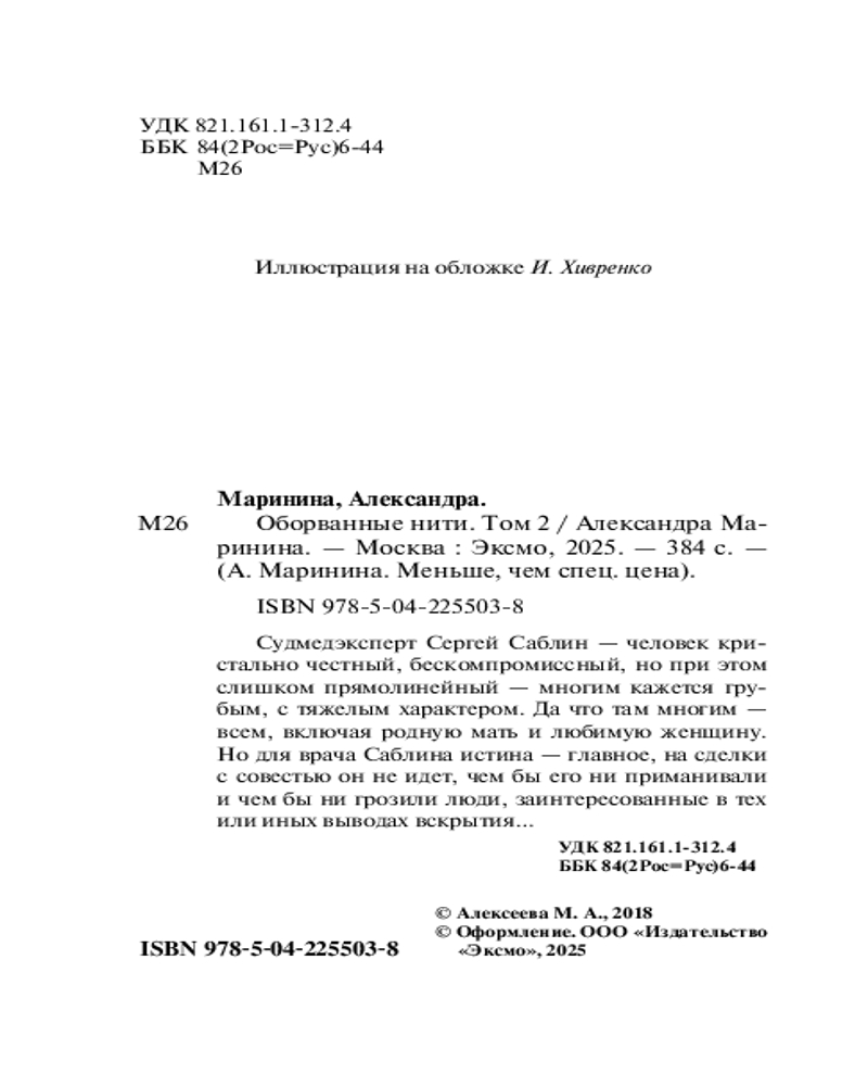 Серия: А.Маринина. Меньше, чем спец.цена (обложка) Рекомендуется любителям захватывающей психологической прозы. «Все работы хороши, выбирай на вкус», — написал классик. Герой романа Александры Марининой «Оборванные нити» послушал этот добрый совет и стал... судмедэкспертом, или, по-простому, патологоанатомом. Мало того, что упоминание этой специальности вызывает у обывателя оторопь, так она еще связана с расследованием самых тяжких преступлений. А действие книги между тем развивается в бандитские девяностые. Роман «Оборванные нити» порадует всех ценителей добротной прозы, насыщенной реалистическими подробностями, достоверными портретами и точными авторскими оценками исторической действительности. Александра Маринина осмелилась хладнокровно заглянуть в самую страшную часть судебного морга — секционную. Текст, изобилующий медицинскими терминами, читается на одном дыхании. Главный герой обладает яркой харизмой и нестандартным характером. «Оборванные нити» демонстрируют совершенно иную грань творчества Александры Марининой. |