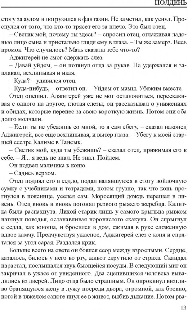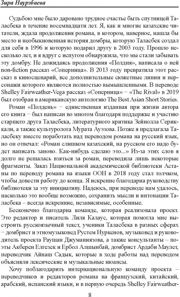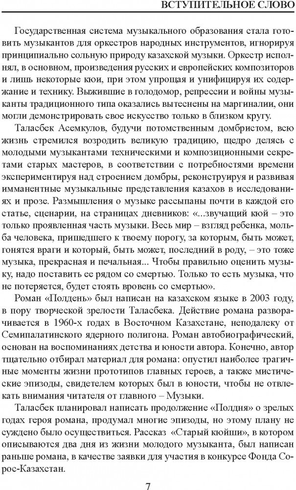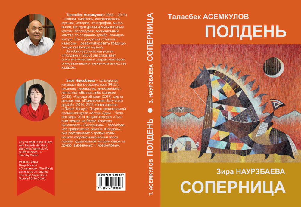 Автобиографический роман потомственного традиционного музыканта, кюйши Таласбека Асемкулова (1955 – 2014) «Полдень» рассказывает о его детстве и юности, о его ученичестве у старых мастеров – хранителей живого подлинного знания Степи, которое в советское время оказалось под негласным запретом. Киноповесть Зиры Наурзбаевой «Соперница» − своеобразное продолжение романа, она рассказывает о зрелых годах нашего современника-кюйши.
