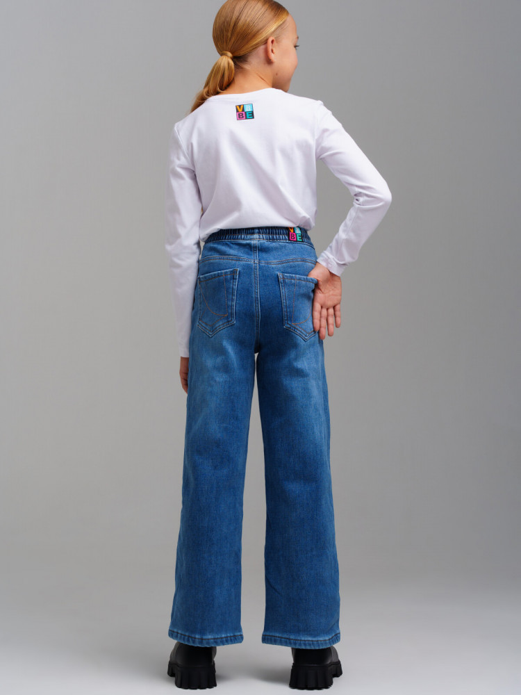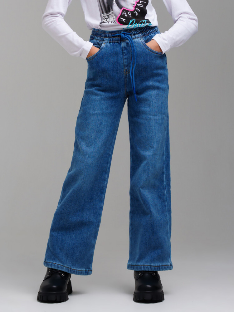 Джинсы с флисом для девочки подростка. Модные утепленные джинсы wide-leg на резинке со шнурком. Боковые карманы. Модель из капсульной коллекции Preppy vibe (Преппи вайб). Соберите полный образ в едином стиле!