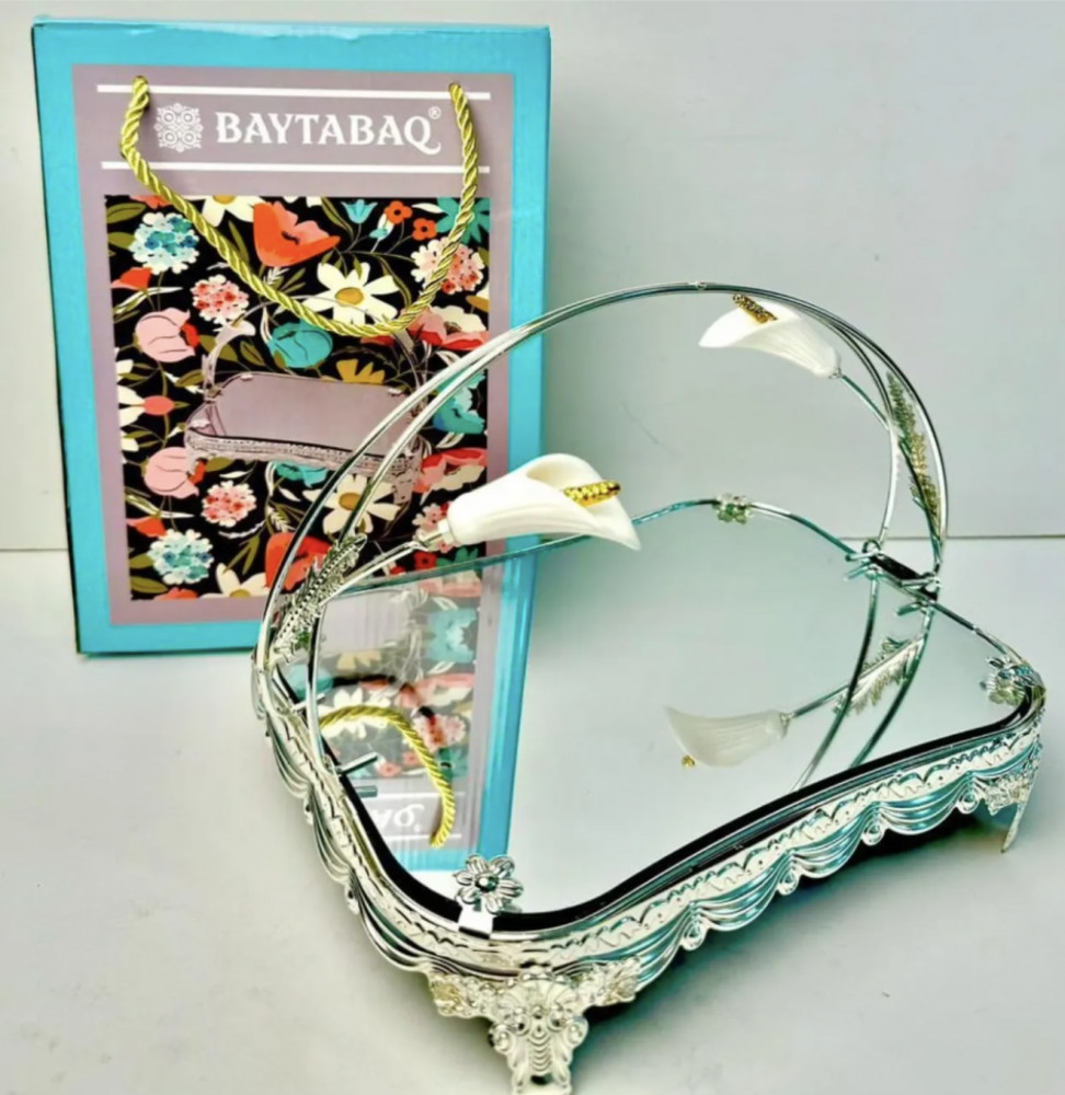 Зеркальный поднос в изящной металлической раме с декоративными элементами. Основание выполнено из зеркала, которое красиво отражает предметы и добавляет блеска сервировке. Борта украшены ажурным орнаментом и нежными цветочными деталями, а ручка-дуга с белыми декоративными лилиями делает поднос не только удобным, но и элегантным. Отличный вариант для подачи сладостей, фруктов или как эффектный акцент в интерьере. |