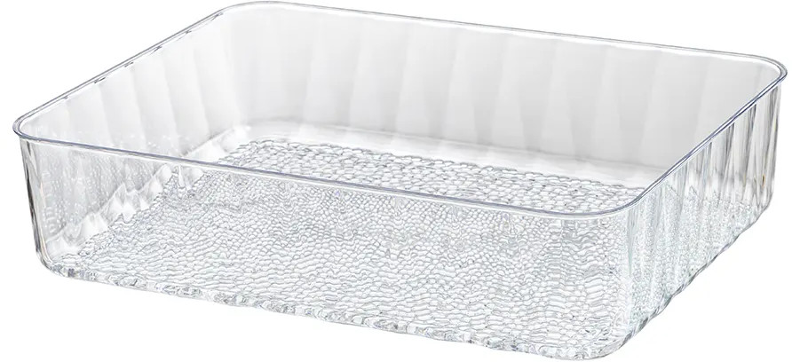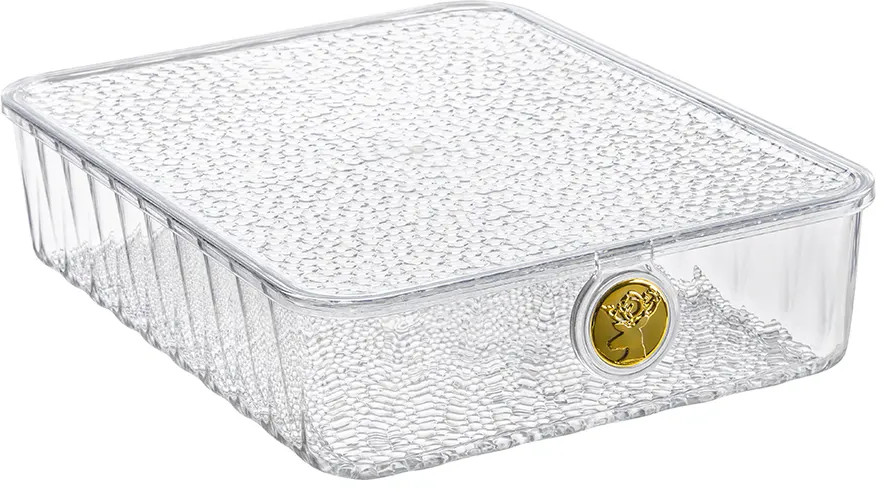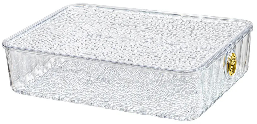 Прямоугольный прозрачный контейнер с крышкой от бренда El Casa размером 33,5×26×8,5 см изготовлен из пластика. Высота без крышки 8 см, размер дна 32×24 см. Пластиковая коробочка подойдет для размещения в прихожей, спальне или любой другой комнате. Имеет прямоугольную форму. Крышка и дно украшены узором, напоминающим водные пузырьки. На крышке есть круглый золотистый элемент с изображением оленя, за который коробочку удобно открывать. Ёмкость поможет держать все на своих местах и создать уют в любой комнате. Разместите органайзер на полке в шкафу для перчаток, белья или носков. В прихожей корзинка пригодится для очков, ключей и визиток, канцелярии и других мелочей.