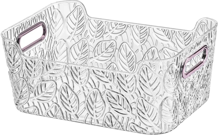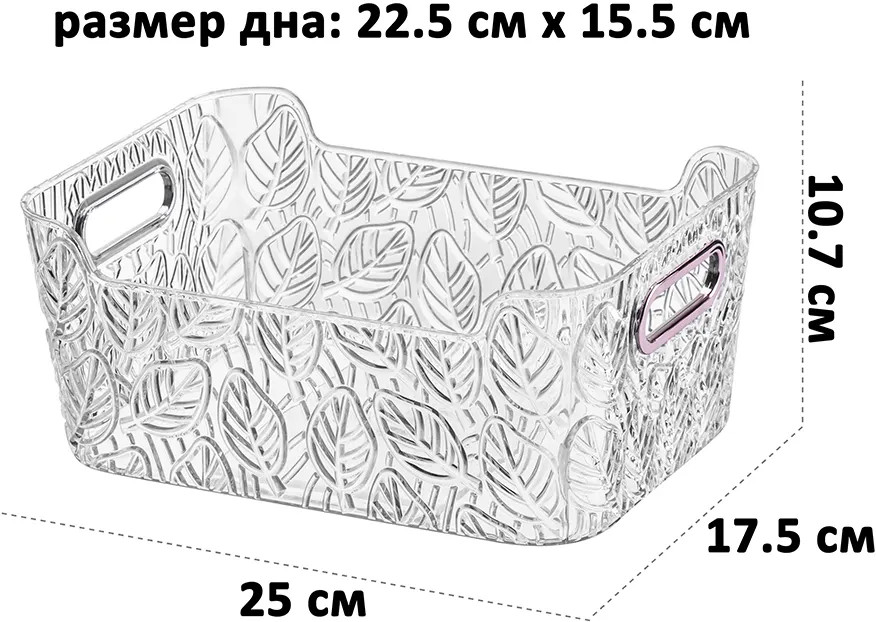 Органайзер для хранения от El Casa поможет вам эстетично и эффектно поддерживать в доме порядок! Размер изделия — 25×17,5×10,7 см, размер дна — 22,5×15,5 см. Изготовлен из пластика. Прозрачная ёмкость украшена рельефным лиственным узором и оснащена металлическими ручками лилового цвета. Благодаря лаконичному дизайну она гармонично дополнит интерьер любой комнаты и найдёт место в разных частях вашего дома. В спальне заполните изделие ватными дисками, ушными палочками или другими средствами уходовой косметики. В прихожей используйте её для ключей, носовых платков или перчаток.