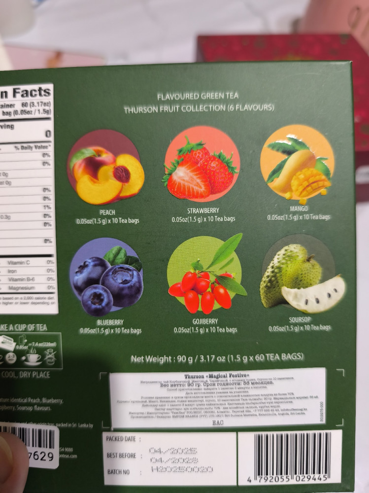 Представляем коллекцию Thurson’s Magical Festive, Green Collection — завораживающую коллекцию ароматизированных зелёных чаёв, которая очарует ваши чувства и выведет ваши чайные ощущения на новый уровень. Откройте для себя дразнящие вкусы персика, клубники, манго, черники, ягоды годжи и сметанного яблока, каждый из которых тщательно продуман, чтобы подарить вам взрыв восхитительных вкусовых ощущений.