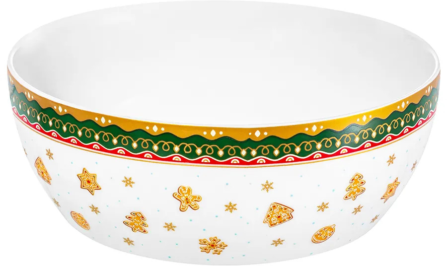 Салатник Elan Gallery «Новогодняя ёлка» выполнен из фарфора нового поколения new bone china, сочетающего в себе изящность и высокую прочность. От классического костяного фарфора new bone china отличается большей экологичностью в производстве. Размер блюда — 20×20×7,5 см, объём — 1,7 литра. Дизайнерская коллекция посуды от бренда Elan Gallery украшена изображением пушистой ёлочки и узором из имбирных пряников и снежинок. Она создаст в вашем доме атмосферу волшебства и подарит праздничное настроение. Салатница круглой формы займёт отличное место в вашей коллекции фарфоровой посуды. Используйте тарелку для любых закусок и угощения гостей на празднике или вечеринке. Подойдет не только для салатов, можно использовать для сервировки любых сладостей, например, конфет или печенья. Положите в фарфоровую ёмкость фрукты или овощи, чтобы порадовать гостей.
