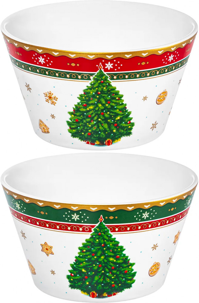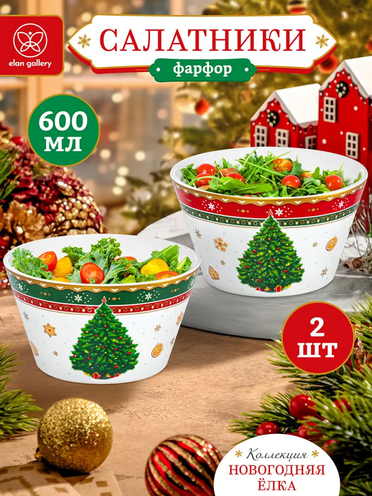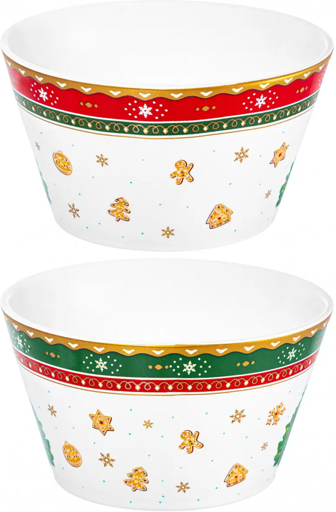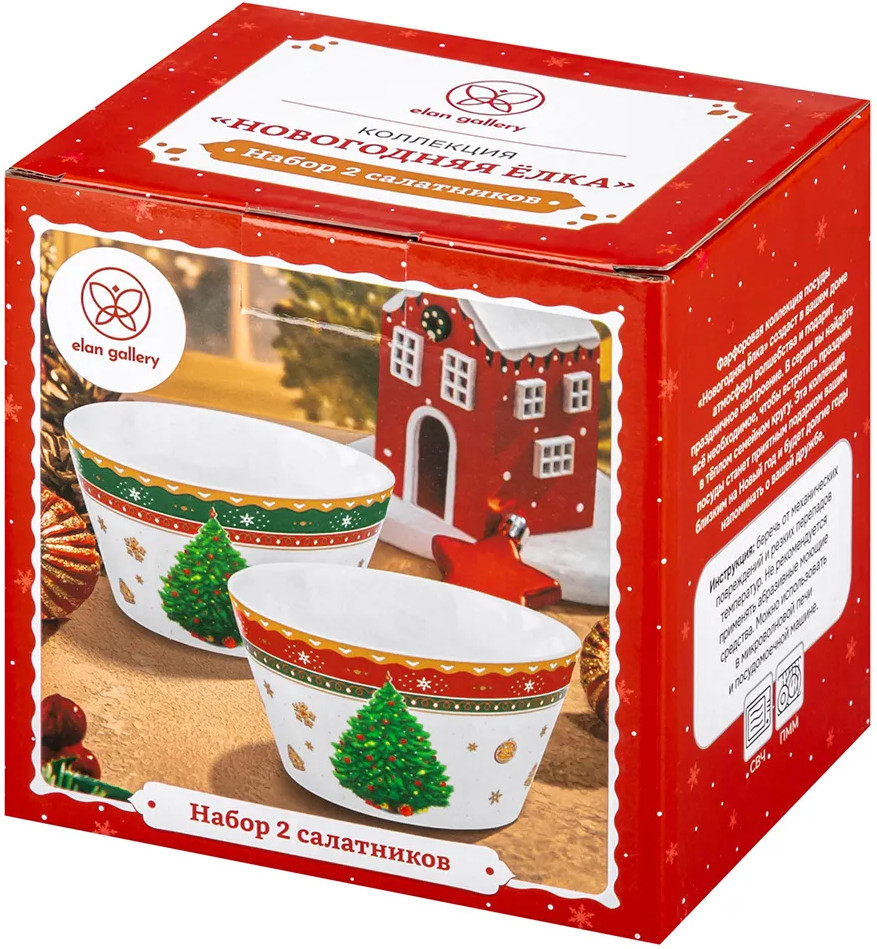 Набор 2 салатников Elan Gallery «Новогодняя ёлка» выполнен из фарфора нового поколения new bone china, сочетающего в себе изящность и высокую прочность. От классического костяного фарфора new bone china отличается большей экологичностью в производстве. Размер каждого блюда — 13×13×7,5 см, объём — 600 мл. Можно использовать в роли суповых тарелок, а также для порций каши или плова. Дизайнерская коллекция посуды от бренда Elan Gallery украшена изображением пушистой ёлочки и узором из имбирных пряников и снежинок. Она создаст в вашем доме атмосферу волшебства и подарит праздничное настроение. Салатницы круглой формы займут отличное место в вашей коллекции фарфоровой посуды. Используйте тарелки для любых закусок и угощения гостей на празднике или вечеринке. Подойдут не только для салатов, можно использовать для сервировки любых сладостей, например, конфет или печенья. Положите в фарфоровую ёмкость фрукты или овощи, чтобы порадовать гостей.