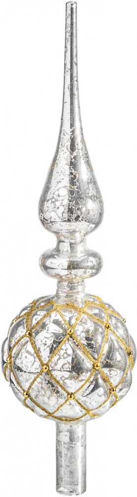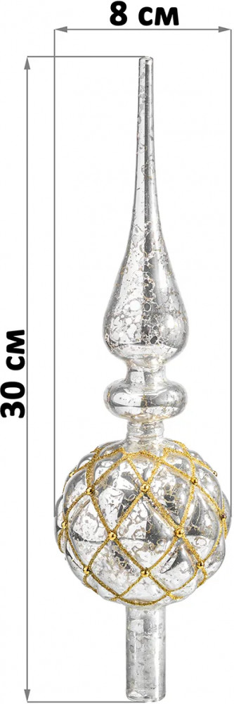 Новогодняя игрушка (наконечник) серебряного цвета с перламутровым оттенком от бренда Elan Gallery украсит вашу ёлочку и создаст праздничную атмосферу для взрослых и детей! Шпиль выполнен из стекла, украшен декором золотого цвета. Основание насаживается на макушку ёлки. Размер новогоднего украшения — 8×30 см. Интерьерный декор можно использовать для создания декоративных композиций, а также нарядить живые ёлки во дворе. Стеклянная фигурка легко надевается на веточку рождественской ели, словно колпачок. Ёлочное украшение надёжно держится за счёт узкого основания-трубочки. Станет прекрасным украшением любого интерьера, вы можете создать новогоднюю композицию с различными сувенирами и еловыми ветками. Станет завершающим элементом для оформления красивых зимних композиций или чудесным подарком на праздник вашим близким. Подарочный сувенир создаст хорошее настроение всей семье. Почувствуйте атмосферу чуда и волшебства, украсив дом в ожидании самого волшебного праздника года! Используйте в роли праздничного декора на вечеринке. Новогодняя (рождественская) игрушки станут украшением вашей квартиры или рабочего кабинета. Интерьерный декор от бренда Элан Галерея поможет ярко отпраздновать Новый год и Рождество!
