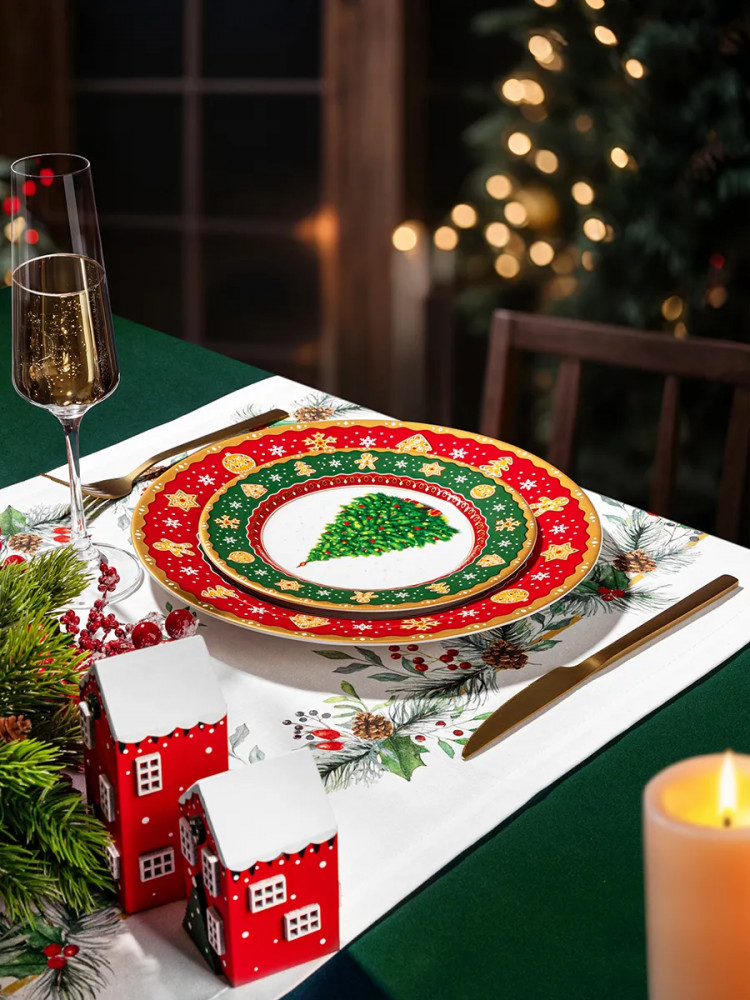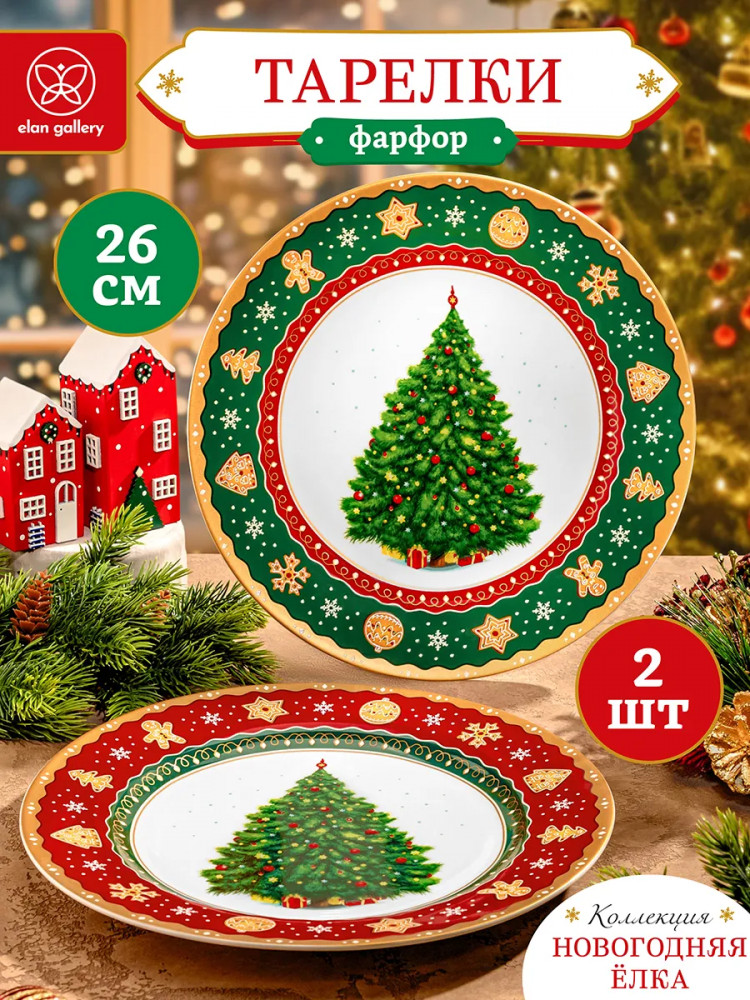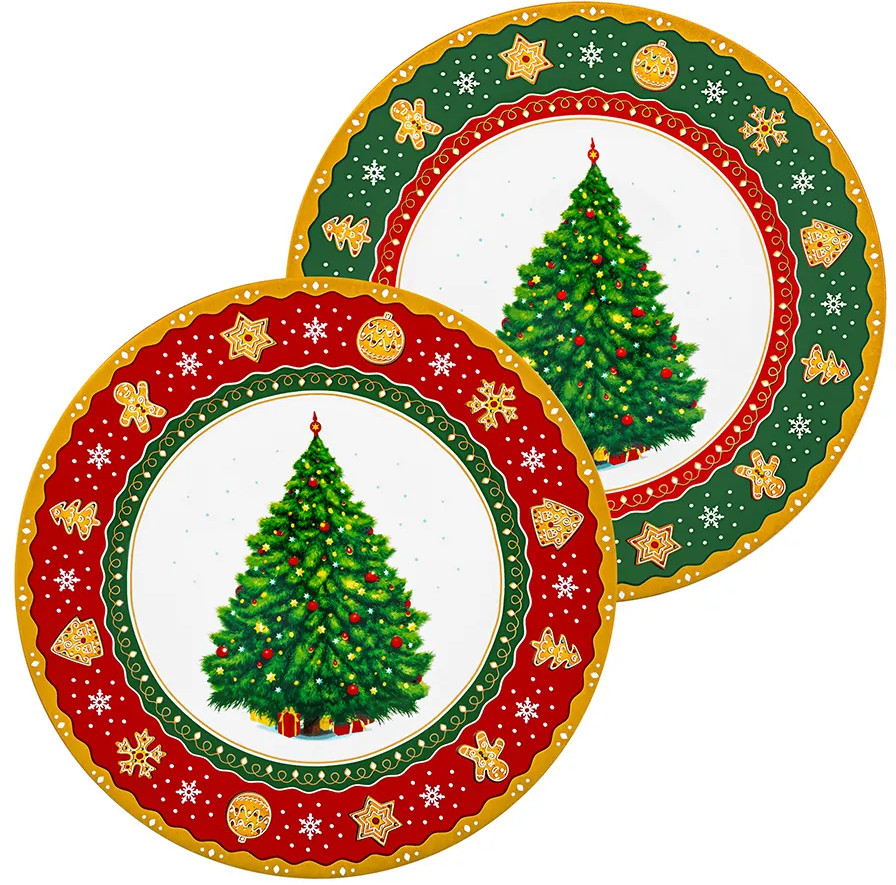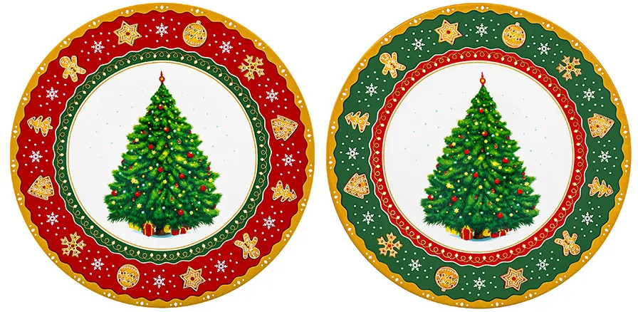Набор 2 тарелок Elan Gallery «Новогодняя ёлка» выполнен из фарфора нового поколения new bone china, сочетающего в себе изящность и высокую прочность. От классического костяного фарфора new bone china отличается большей экологичностью в производстве. Размер каждой тарелки — 26×26×2 см. Дизайнерская коллекция посуды от бренда Elan Gallery украшена изображением пушистой ёлочки и узором из имбирных пряников и снежинок. Декоративная посуда с ярким рисунком создаст в вашем доме атмосферу волшебства и подарит праздничное настроение. Большие плоские тарелки для подачи на стол ваших любимых блюд и гарниров станут незаменимой вещью в любом доме. Набор обеденных тарелок отлично подойдёт для любых закусок, например, фруктов или нарезки.