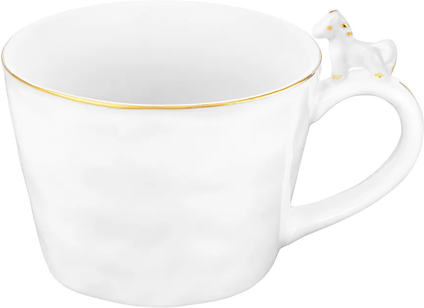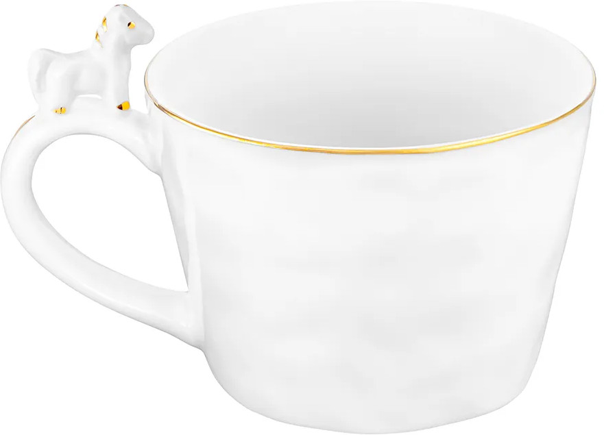 Кружка «Лошадь» от Elan Gallery предназначена для эстетичной сервировки вашего стола. Размер ёмкости — 14×10×9,5 см, объём — 300 мл. Выполнена из высококачественного белого фарфора. Он не впитывает цвет напитков и легко отмывается, благодаря чему надолго сохранит свою белизну. Изделие украшено золотистой каймой. На ручке изделия стоит крошечная очаровательная лошадка с золотистыми элементами. Фарфоровая посуда станет изящным дополнением интерьера любой кухни или столовой. Кофейная кружка поможет провести множество приятных завтраков с капучино и латте, а также уютные чайные вечера с конфетами, вафлями, другими десертами и сладостями. Подойдёт ценителям чая и кофе, которые любят пить из красивой и необычной посуды. Согрейтесь зимой любимым напитком: какао с маршмэллоу, ягодным чаем, горячим шоколадом или глинтвейном. Летом освежитесь домашним лимонадом или морсом.