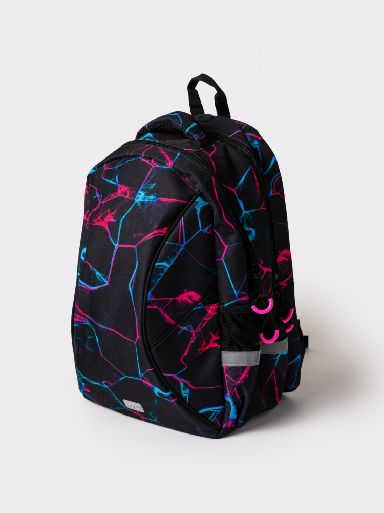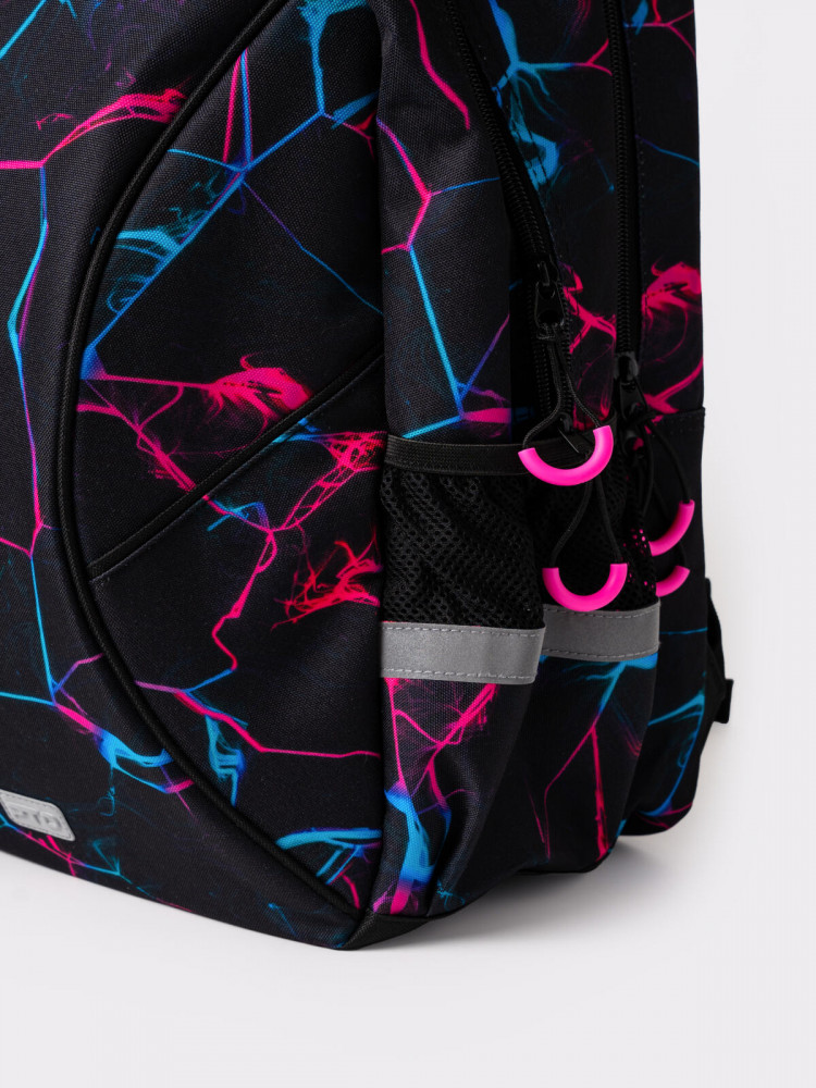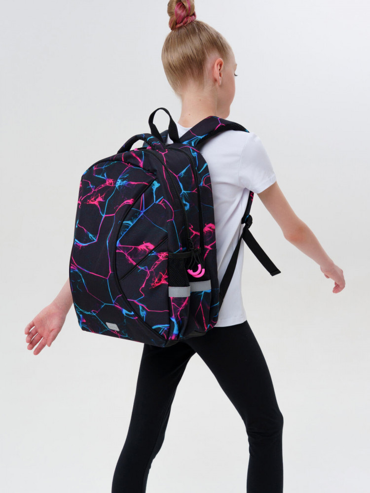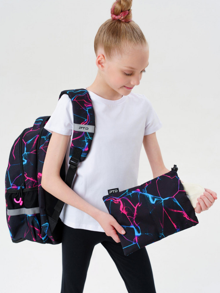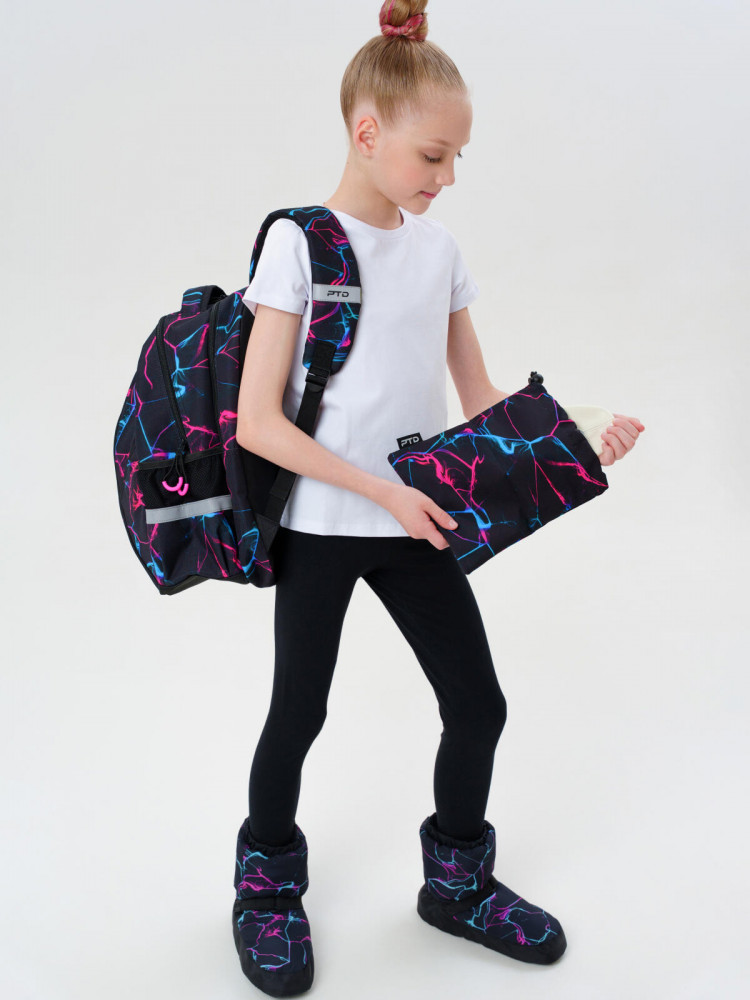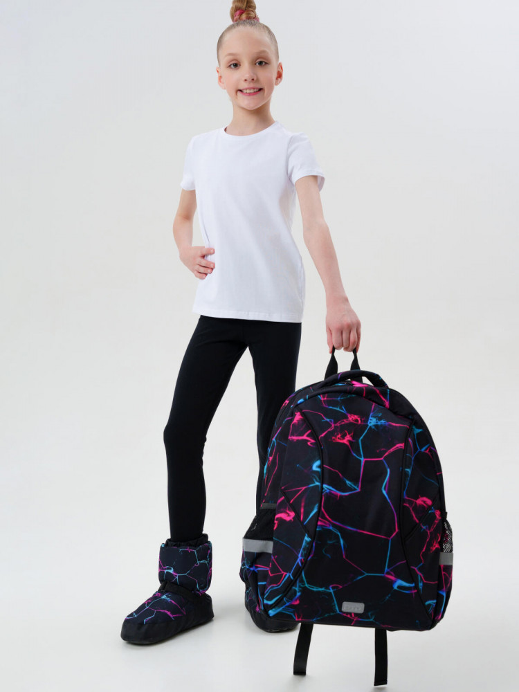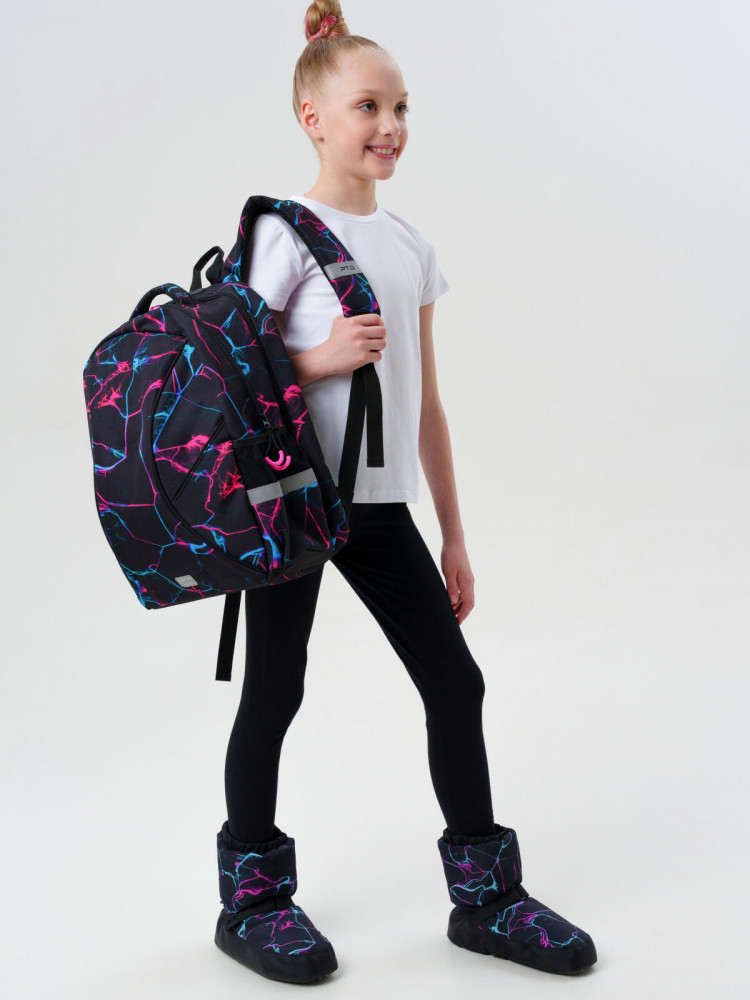 Спортивный рюкзак для художественной гимнастики для девочки подростка. Гимнастический рюкзак имеет два отделения с различными карманами внутри. В основном вместительном отделении расположены два боковых кармана на резинке для скакалки и полупальцев, также внутренний карман на молнии для телефона или документов. Второе отделение с двумя карманами под булавы и карманом для палочки с отверстием для нее. Сбоку имеются карманы из сетки на резинке. Широкие мягкие вентилируемые лямки регулируются по высоте. У рюкзака есть ручка для ношения в руке и для того, чтобы его можно было вешать на вешалку. Ранец имеет светоотражающие детали на лямках, по бокам, на переднем отделении, чтобы ребенка было хорошо видно в темноте со всех сторон. В подарок идет текстильный чехол для гимнастических принадлежностей. К рюкзаку можно подобрать спортивную сумку и чехлы для «предметов» художественной гимнастики в едином дизайне.