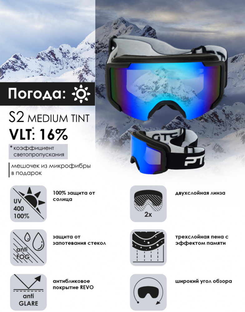 Детская горнолыжная маска PlayToday — безопасность, комфорт и отличная видимость на склоне. Преимущества детской маски PlayToday: двойная линза категории S2 — обеспечивает отличную видимость и высокую контрастность при большинстве погодных условий; цвет линзы: серый с red full revo покрытием — защита от бликов, улучшенная чёткость и стильный внешний вид; VLT 30% и SPF 18–43% — сбалансированная светопропускная способность и полная защита от ультрафиолетовых лучей (UV 100%); зеркальное покрытие — отражает лишний свет и повышает эффективность фильтрации; anti-fog обработка — защита от запотевания в условиях перепада температур; три слоя мягкого пенного уплотнителя — комфортное прилегание без давления и натирания; широкий ремешок (4 см) с противоскользящей силиконовой вставкой — надёжная фиксация, не сползает при активном движении; универсальный размер (153.5×83.1 мм) — совместимость со всеми детскими шлемами; соответствует стандарту ISO 18527-1 — международное качество и безопасность.