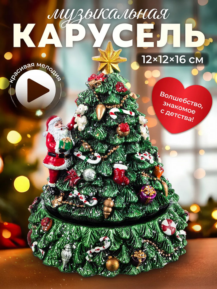 Механическое изделие не требует зарядки и батареек — достаточно повернуть верхнюю часть ёлки по линии механизма. Крутящаяся фигурка проигрывает приятную рождественскую музыку, навевая воспоминания о тёплых вечерах, проведённых в кругу семьи. Время — 3-4 минуты в зависимости от силы завода. Поставьте милую настольную фигурку на комод, полку или возле компьютера, чтобы добавить интерьеру дух любимых зимних праздников. Оригинальная игрушка в стиле винтаж станет прекрасным сувениром на память и отличным подарком для друзей и близких. Благодаря яркому дизайну фигурное декоративное изделие понравится ребёнку, подростку или взрослому. Подойдёт как девочке, так и мальчику. Оно послужит необычным инвентарём для декора вашего дома. Поставляется в красной картонной коробке — благодаря ей вам не потребуется дополнительная подарочная упаковка. Музыкальная карусель от бренда Элан Галерея поможет вам погрузиться в атмосферу Нового года и Рождества и наполнит дом уютом и светлой праздничной магией!