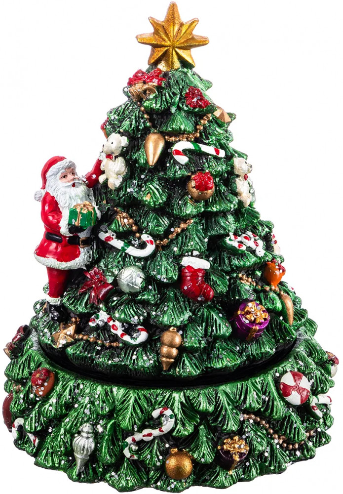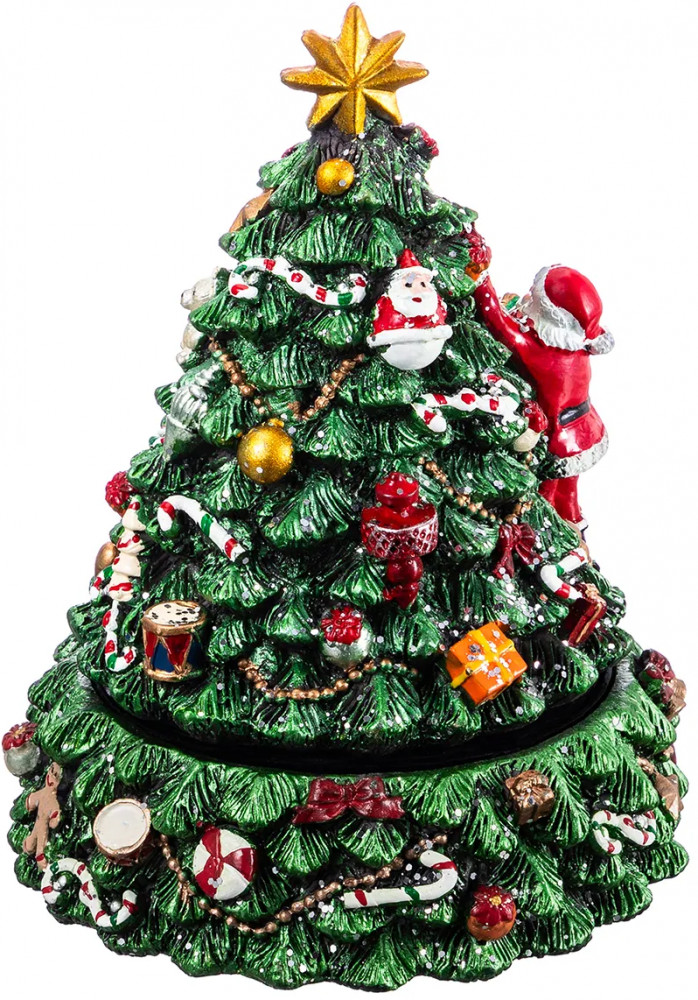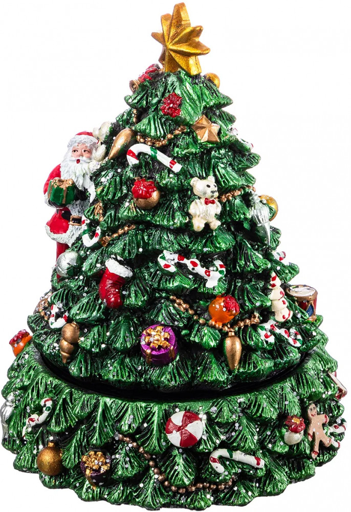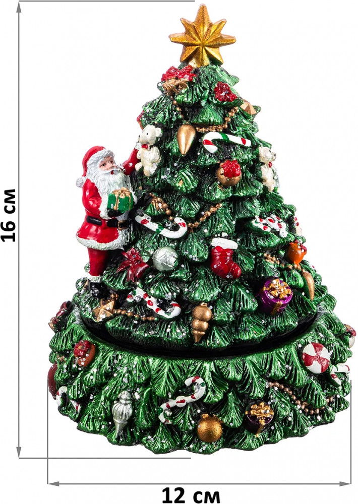 Музыкальная карусель «Рождественская ель» от Elan Gallery — это маленькое путешествие в дивный мир зимней сказки. Её размер — 12×12×16 см. Выполнена из полистоуна — современного материала, который славится своей прочностью, износостойкостью и устойчивостью к перепадам температур. Он не подвержен деформации и не выделяет вредных веществ. Полистоун легко поддаётся обработке, поэтому изделия из него отличаются высокой детализацией. На красивой зелёной ёлке развешаны новогодние украшения: шары, конфеты и другие символы праздника, а также большая фигурка Деда Мороза с подарком. Поверхность присыпана блёстками, напоминающими снежинки. Верхушку венчает большая золотая звезда. Основание оснащено мягким противоскользящим покрытием.