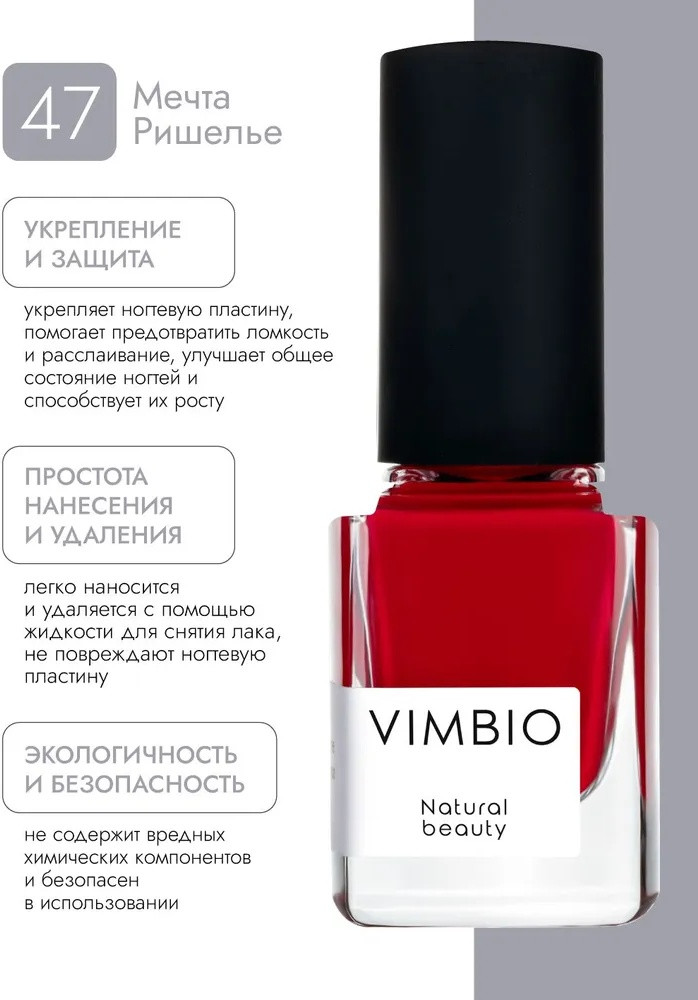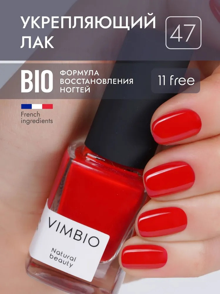 Укрепляющие лаки 11 Free VIMBIO Natural Beauty с уникальным VN-комплексом — это сочетание стойкости, безопасности и ухода за ногтями. Формула не содержит вредных химических компонентов и обогащена витаминами, кальцием и экстрактами водорослей, благодаря чему ногти становятся крепкими, увлажнёнными и ухоженными. При использовании базы и топа покрытие сохраняет яркость и блеск до 10 дней без сколов, а гелевая текстура и удобная кисточка обеспечивают лёгкое и равномерное нанесение. Лак быстро сохнет без лампы, что делает его максимально комфортным в использовании. Кальций укрепляет ногтевую пластину, витамин B5 питает и предотвращает ломкость, экстракты водорослей увлажняют, а витамин E защищает от повреждений. С VIMBIO вы получаете не только красивый маникюр, но и полноценный уход — сила, здоровье и красота ваших ногтей в каждом флаконе.