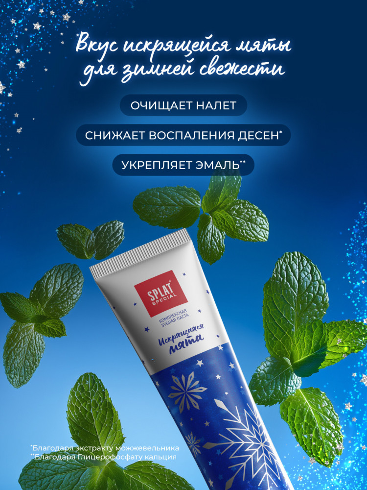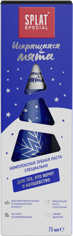 Мерцающая зубная паста Splat с блестками «Искрящаяся мята» — это лимитированная коллекция к Новому Году, созданная специально для тех, кто верит в волшебство. Начни Новый Год с улыбки и окунись в атмосферу праздника уже сегодня! Мерцающие блестки делают процесс чистки ярким и приятным. Зубная паста сочетает в себе уход для зубов и полости рта, обеспечивая комплексную защиту. Инновационная формула зубной пасты содержит компоненты, обладающие антибактериальным действием и способствующие снижению воспаления полости рта.