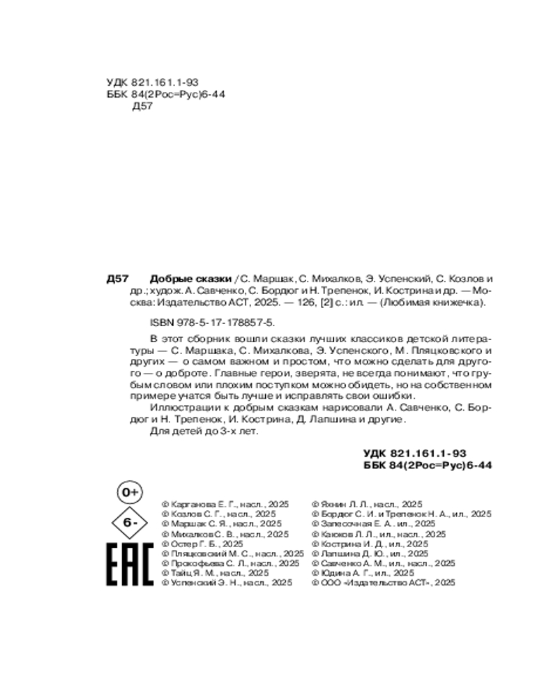Серия: Любимая книжечка В этот сборник вошли сказки лучших классиков детской литературы — С. Маршака, С. Михалкова, Э. Успенского, М. Пляцковского и других — о самом важном и простом, что можно сделать для другого — о доброте. Главные герои, зверята, не всегда понимают, что грубым словом или плохим поступком можно обидеть, но на собственном примере учатся быть лучше и исправлять свои ошибки. |