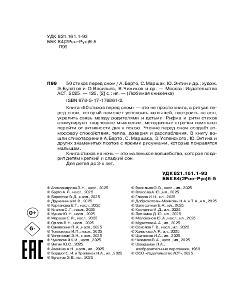 Серия: Любимая книжечка Книга «50 стихов перед сном» — это не просто книга, а ритуал перед сном, который поможет успокоить малышей, настроить на сон, укрепить связь между родителями и детьми. Рифма и ритм стихов стимулируют творческое мышление, мелодичные строчки помогают перейти от активности дня к покою. Чтение перед сном создаёт атмосферу спокойствия, тепла, доверия и расслабления. В книгу вошли стихотворения А. Барто, С. Маршака, Э. Успенского, Ю. Энтина и других знаменитых поэтов с яркими рисунками, которые понравятся малышам. |