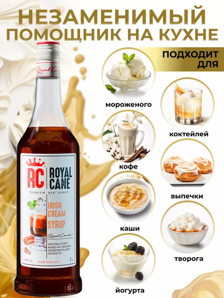 Сироп имеет насыщенный вкус, благодаря сочетанию оттенков сладкой карамели, сливок и ирландского виски. Натуральная добавка с глубоким сливочным ароматом очень популярна среди барменов, а также широко используется в домашних условиях. Прекрасно подходит в качестве дополнения вкуса десертов, мороженого, фруктовых салатов, блинов и панкейков, пропитки бисквитных коржей для пирожных и тортов, выпечки и печенья. Помимо этого, сироп добавляют в алкогольные коктейли на основе водки, джина, виски и рома. Купив сироп «Ирландский крем» торговой марки Royal Cane Вы можете сделать прекрасный подарок как себе так и своим родным и друзьям, которые являются ценителями кофе или любителями коктейльных вечеринок и домашней кулинарии.