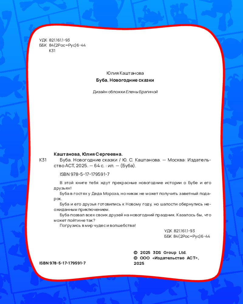 Серия: Буба В этой книге тебя ждут прекрасные новогодние истории о Бубе и его друзьях! Буба в гостях у Деда Мороза, но никак не может получить заветный подарок. Буба и его друзья готовились к Новому году, но шалости обернулись неожиданным приключением. Буба позвал всех своих друзей на новогодний праздник. Казалось бы, что может пойти не так? Погрузись в мир чудес и волшебства! |