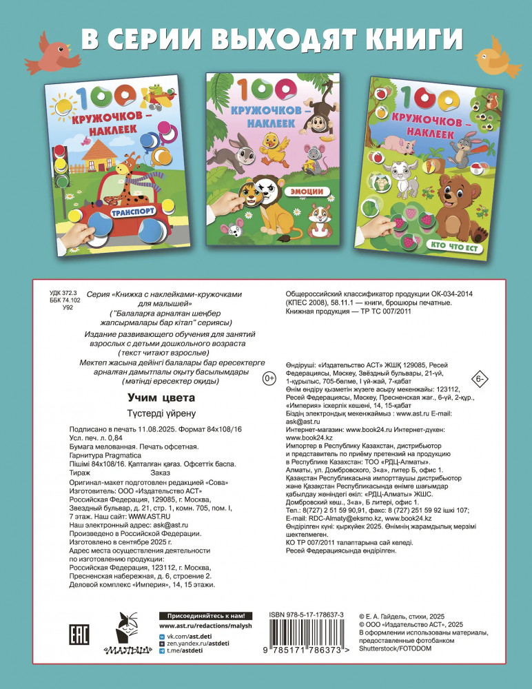 💳 Оплатить за товар можно при получении 🇰🇿 Есть бесплатная доставка по Казахстану от 1 дня 🎁 Копите бонусы с каждой покупки Серия: Книжка с наклейками-кружочками для малышей «Учим цвета» — это отличная развивающая книга с красивыми рисунками + 100 кружочков-наклеек разного размера. На каждой страничке сюжетные картинки, понятные ребёнку, — он сможет показать и рассказать, что лягушонок зелёный, а цыплёнок жёлтый. В лёгкой игровой форме малыш познакомится с основными цветами, научится их различать, запомнит их названия. Простые потешки со звукоподражаниями — идеально для запуска речи и развития интеллекта. Бумага плотная и качественная. Крупные круглые наклейкфи с хорошей печатью, легко отделяются от основы — прекрасно подойдут для детских пальчиков. Подбирать наклейки для каждой картинки — весело, увлекательно и полезно. Сенсорная игра развивает мелкую моторику, внимание, усидчивость, координацию движений, пространственное мышление, фантазию и эмоциональный интеллект. |