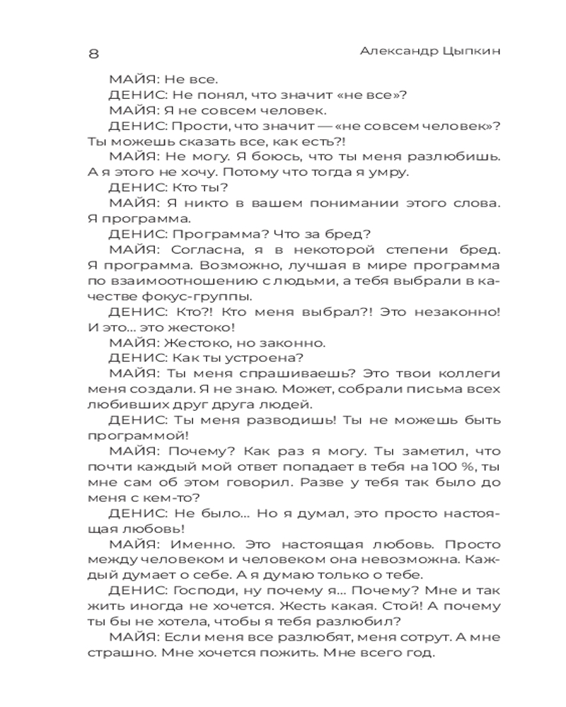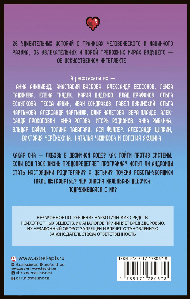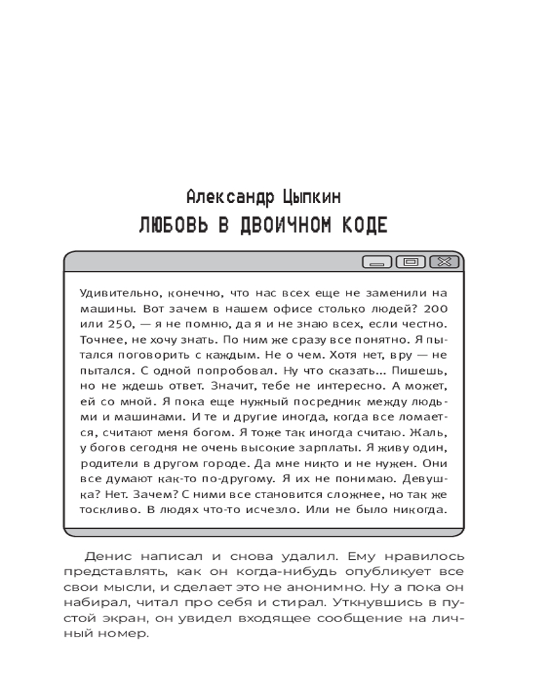 Какая она — любовь в двоичном коде? Как пойти против системы, если всю твою жизнь предопределяет программа? Могут ли андроиды стать настоящими родителями? А детьми? Почему роботы-уборщики такие жутковатые? Чем опасна маленькая девочка, подружившаяся с ИИ? |