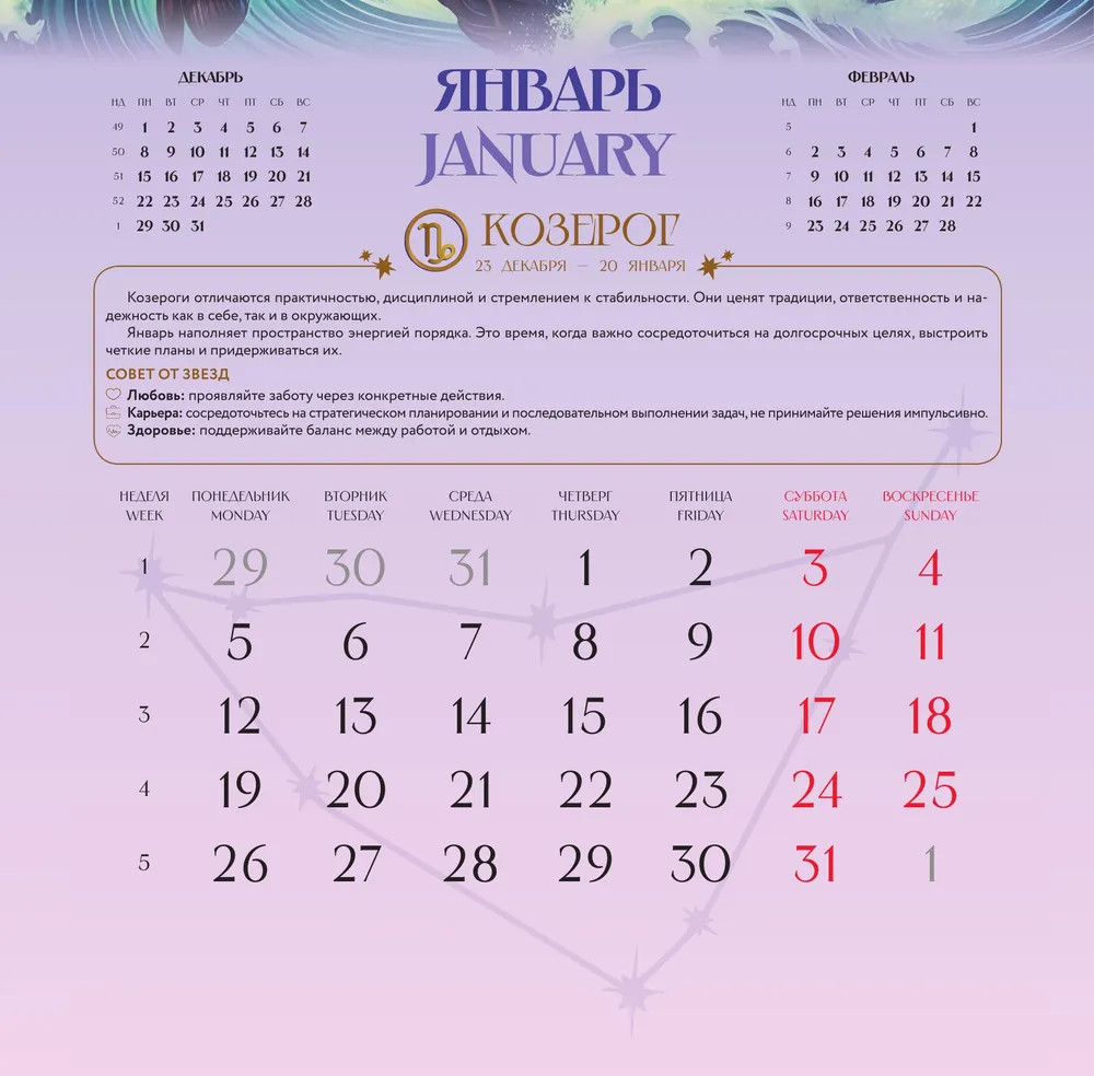 Серия: Календарь настенный на 2026 год Погрузитесь в мир астрологии с этим атмосферным настенным календарем, где каждый месяц несет энергию одного знака зодиака. Здесь вы найдете краткие характеристики всех 12 знаков зодиака, описание астрологической энергии месяца, советы от звезд на каждый месяц в любви, карьере и здоровье. Каждая страница украшена чарующими иллюстрациями знаков зодиака. Этот календарь поможет жить в гармонии с энергетическими циклами, а также станет отличным украшением вашего интерьера. |