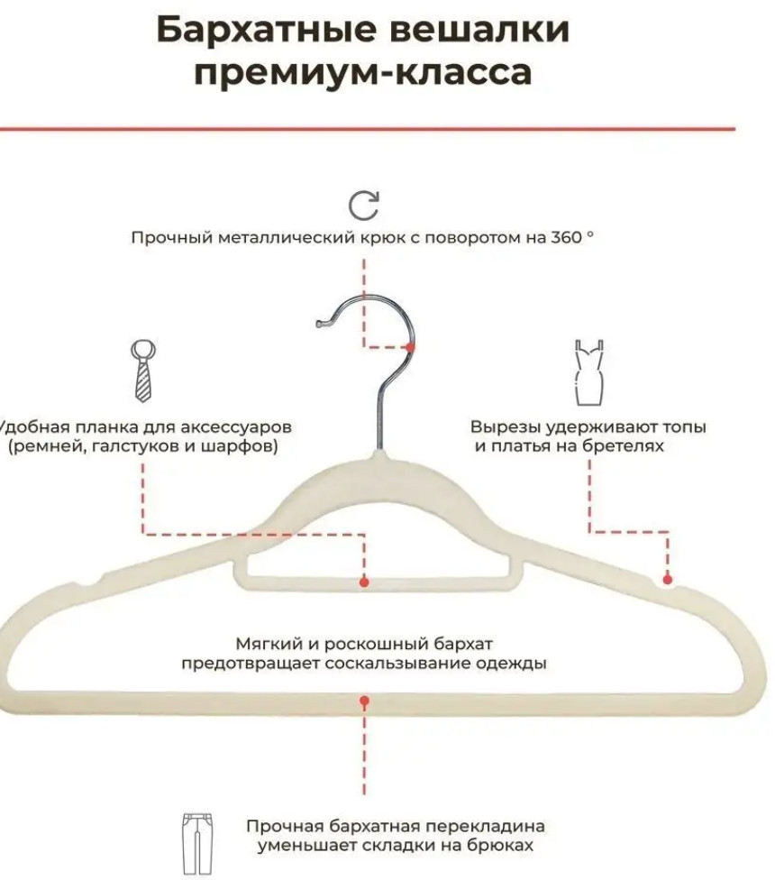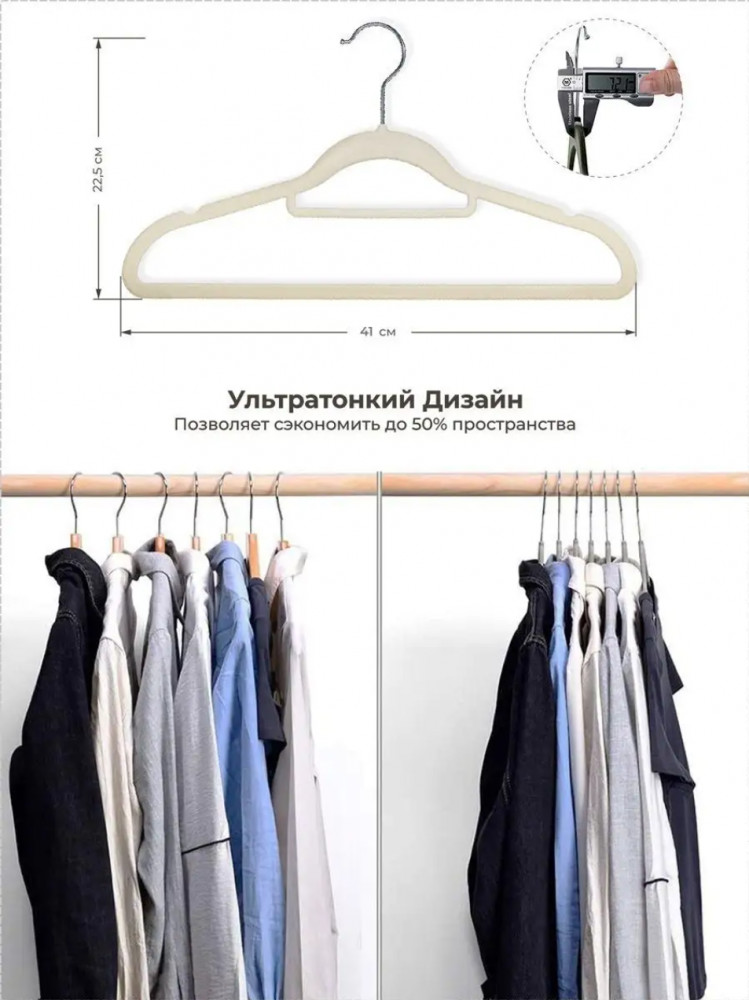 Набор ультратонких велюровых вешалок плечиков со специальным нескользящим покрытием из высококачественного бархатного материала. Прочная и гибкая вешалка для брюк с углублениями по кромке или тремпель подойдет как для легкой одежды, брюк, вещей с бретелями, так и для тяжелой верхней одежды. Идеальный размер вешалок в прихожую позволит компактно и удобно хранить вещи, не будет занимать много места в гардеробной и шкафу. Велюровое покрытие плечиков для брюк позволит одежде не соскальзывать и не деформироваться, а также предотвратит от зацепок. Наша бархатная вешалка-плечики для вещей это стильный и красивый аксессуар, который порадует взгляд даже самой взыскательной хозяйки и подойдет под любой интерьер спальни или прихожей. А также как вешалка для белья в ванную комнату и вешалка для сушки белья. Благодаря размерам вешалки костюмные удобно брать в путешествия или в командировки.