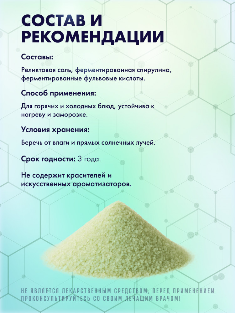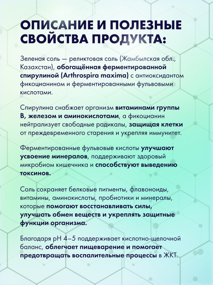 💳 Оплатить за товар можно при получении 🇰🇿 Есть бесплатная доставка по Казахстану от 1 дня 🎁 Копите бонусы с каждой покупки Зеленая соль — реликтовая соль (Жамбылская обл., Казахстан), обогащённая ферментированной спирулиной (Arthrospira maxima) с антиоксидантом фикоцианином и ферментированными фульвовыми кислотами. Спирулина снабжает организм витаминами группы B, железом и аминокислотами, а фикоцианин нейтрализует свободные радикалы, защищая клетки от преждевременного старения и укрепляя иммунитет. |