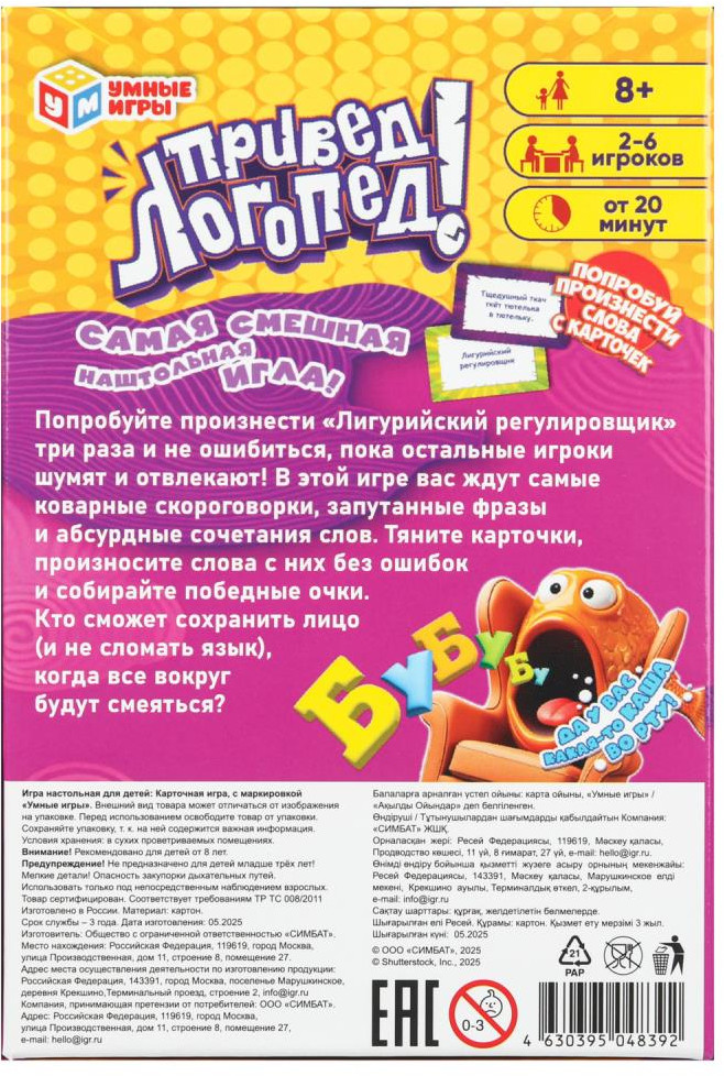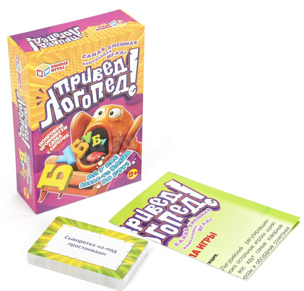 💳 Оплатить за товар можно при получении 🇰🇿 Есть бесплатная доставка по Казахстану 🎁 Копите бонусы с каждой покупки Карточная игра «Привед, логопед!» ТМ «Умные игры» — это точно самая смешная настольная игра, в которой вы когда-либо принимали участие. Попробуйте произнести «Лигурийский регулировщик» три раза и не ошибиться, пока остальные игроки шумят и отвлекают! В этой игре вас ждут самые коварные скороговорки, запутанные фразы и абсурдные сочетания слов. Тяните карточки, произносите слова с них без ошибок и собирайте победные очки. Кто сможет сохранить лицо (и не сломать язык), когда все вокруг будут смеяться? |