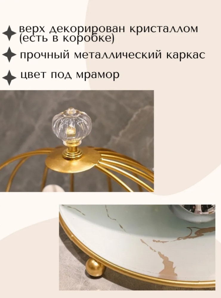 Настольная подставка изготовлена из качественного металла золотого цвета, а дно выполнено из стекла в виде белого мрамора, благодаря чему легко очищается от загрязнений. Декоративный поднос с бортиком может служить вам как украшение интерьера. Органайзер для хранения косметики и аксессуаров — это универсальный предмет, который поможет организовать пространство в ванной комнате, ванну, кухне, на столе или комоде, шкафу или в домашнем кабинете. Можете ее использовать как полка в ванную или этажерка, полка для ванной без сверления. Подставка идеально подходит для размещения свечей, ваз с цветами, косметики или других декоративных элементов, добавляя им дополнительную привлекательность