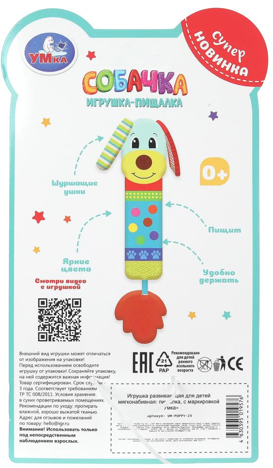 Текстильная игрушка-погремушка с пищалкой «Собачка» ТМ «УМка» разработана специально для самых маленьких. Эта игрушка в виде забавного пёсика выполнена из очень мягкого и гипоаллергенного материала красочной расцветки. При нажатии игрушка издаёт забавный пищащий звук, а если её потрясти — весело загремят шарики, надежно спрятанные внутри. Прорезыватель интересной формы из качественного безопасного материала пригодится малышу, когда у него будут резаться зубки. |