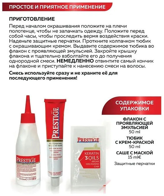 Способ применения: перед использованием средства проведите тест на чувствительность кожи. Для того чтобы не запачкаться положите на плечи полотенце или пелерину, наденьте перчатки. Проткните колпачком тюбик с окрашивающим кремом. Выдавите содержимое тюбика во флакон с проявляющей эмульсией. Закройте крышку флакона и тщательно взболтайте его до получения однородной смеси. Немедленно отвинтите самый кончик на флаконе и приступайте к нанесению смеси на волосы. Оставьте краску на волосах на 20-30 минут. Выдержав необходимое время воздействия, вспеньте смесь на волосах с небольшим количеством теплой воды. Затем тщательно промойте волосы большим количеством воды, пока вода не станет прозрачной. Далее нанесите на волосы маску и оставьте на 2-3 минуты, после тщательно смойте водой.