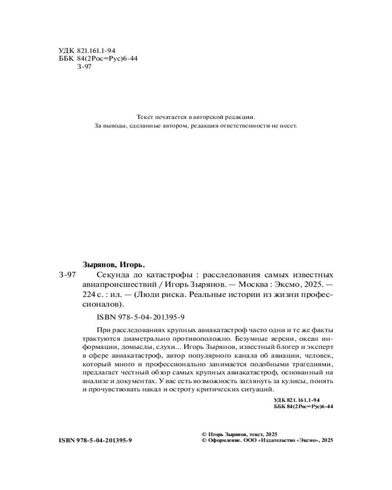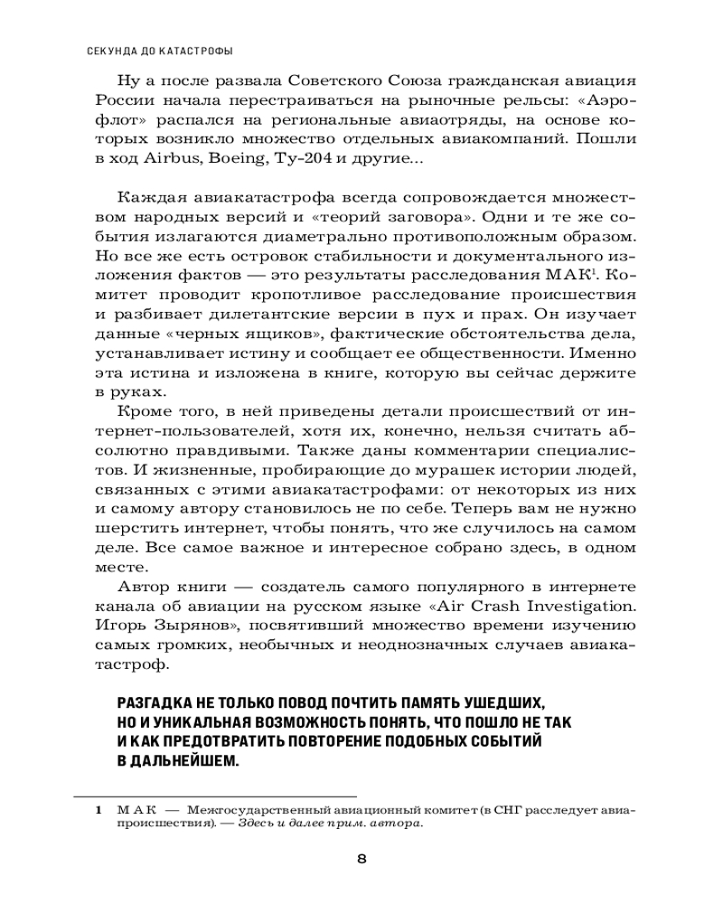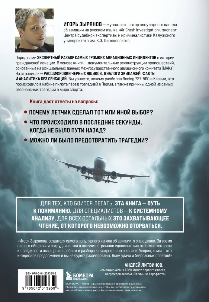Внутри книги — подробный анализ разных происшествий, включая Казань, Пермь, Анапа—Питер и другие резонансные случаи. Читатель увидит, что происходило в кабине пилотов в последние секунды, поймет логику действий экипажа.