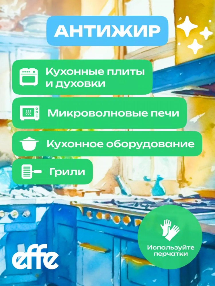 Чистящее средство Антижир для кухни Effe спрей 600 мл — современная бытовая химия, является отличным помощником для уборки дома. Обладает мощной пеной, бережно очищает поверхность и поддерживает ежедневную чистоту без лишних усилий. Удаляет жир, нагар, копоть и пригоревшую пищу с эмалированных, хромированных поверхностей, изделий из стекла, нержавеющей стали, фаянса, фарфора, кухонных плит, мультиварок, фритюрниц, грилей, духовых шкафов и микроволновых печей. Прекрасный стеклоочиститель. Жироудалитель содержит активные вещества, расщепляющие жир, действие которых гарантирует быстрый результат без особых усилий. Содержащие в составе активные вещества, которые позволяют очистить до блеска даже фритюрный прибор. Моющие средства сделает кухню максимально чистой и блестящей. Многофункциональное средство анти жир подойдет для мытья окон, стекол или зеркал от капель жира или других трудно удаляемых пятен. Достаточно нанести растворитель на поверхность, а через полминуты смыть водой или протереть тряпкой.