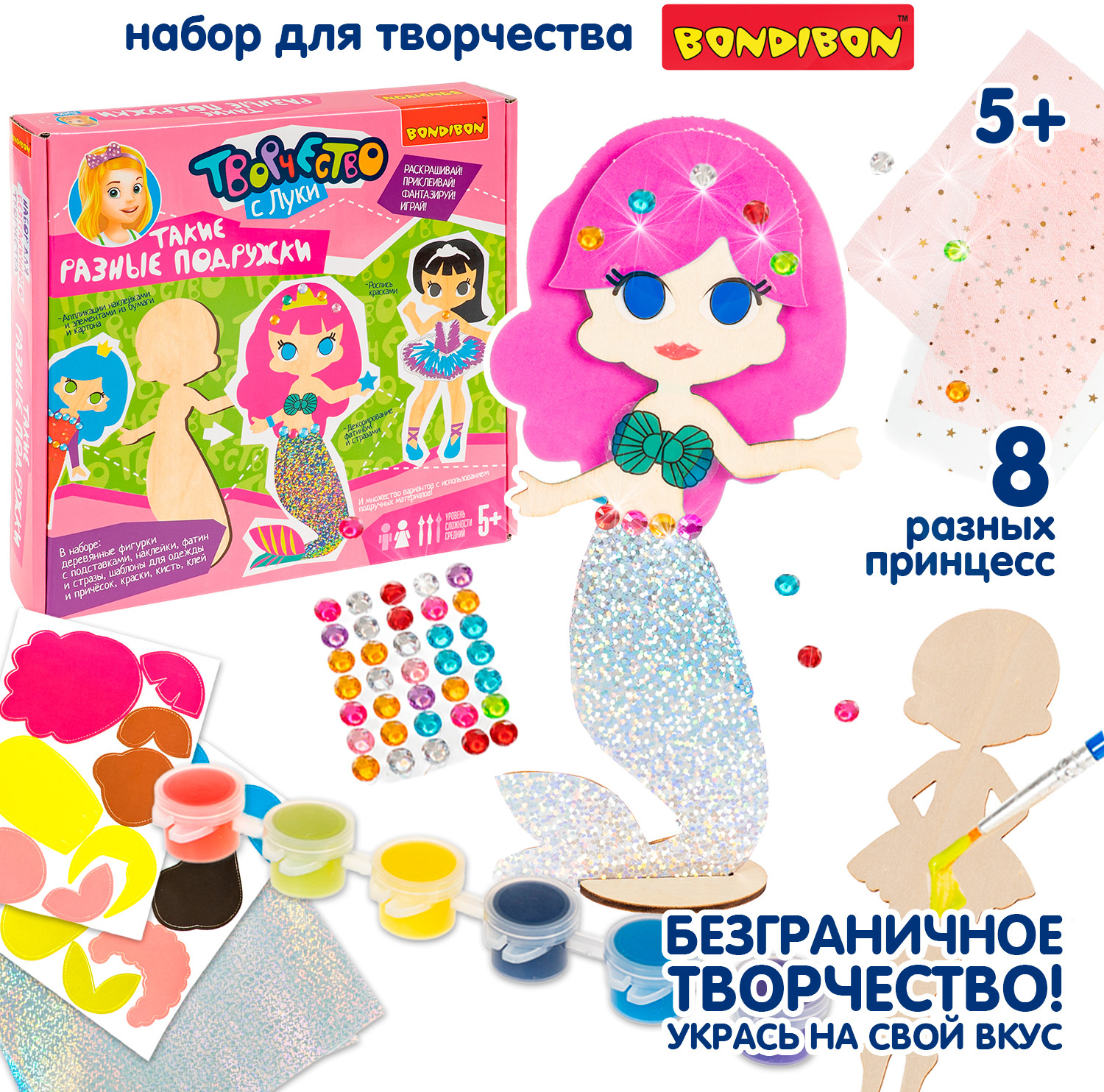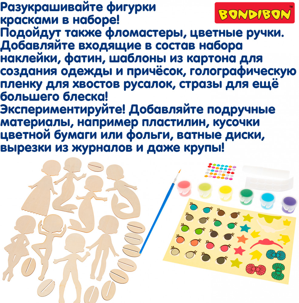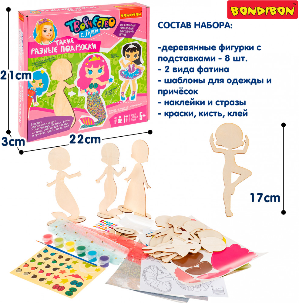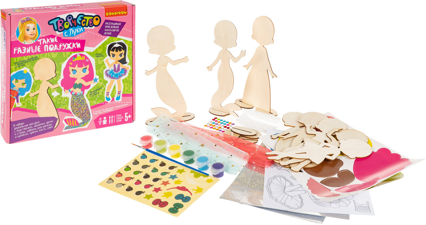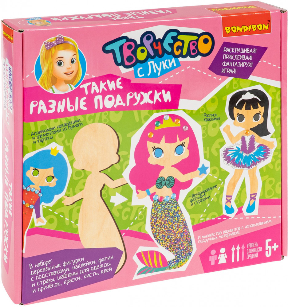 Серия: Творчество с Луки Набор для творчества Bondibon «Такие разные подружки» — это увлекательный творческий процесс, который понравится каждому ребёнку! Юные художники смогут раскрасить, украсить и оживить персонажей с помощью красок, наклеек, элементов одежды и причёсок. Набор помогает развить воображение и творческие способности, тренирует мелкую моторику, усидчивость и вкус. Ребёнок создаёт наряды, комбинирует аксессуары и продумывает образы героинь — от балерины до русалки разных по стилю и характеру. Набор для творчества «Такие разные подружки» — не просто игра, а настоящая школа стиля и фантазии и отличный подарок для креативного ребенка! Размер фигурок — до 17 см. Игра для детей от 5 лет. Познакомьтесь и с другими наборами серии для безграничного творчества от бренда Бондибон. |