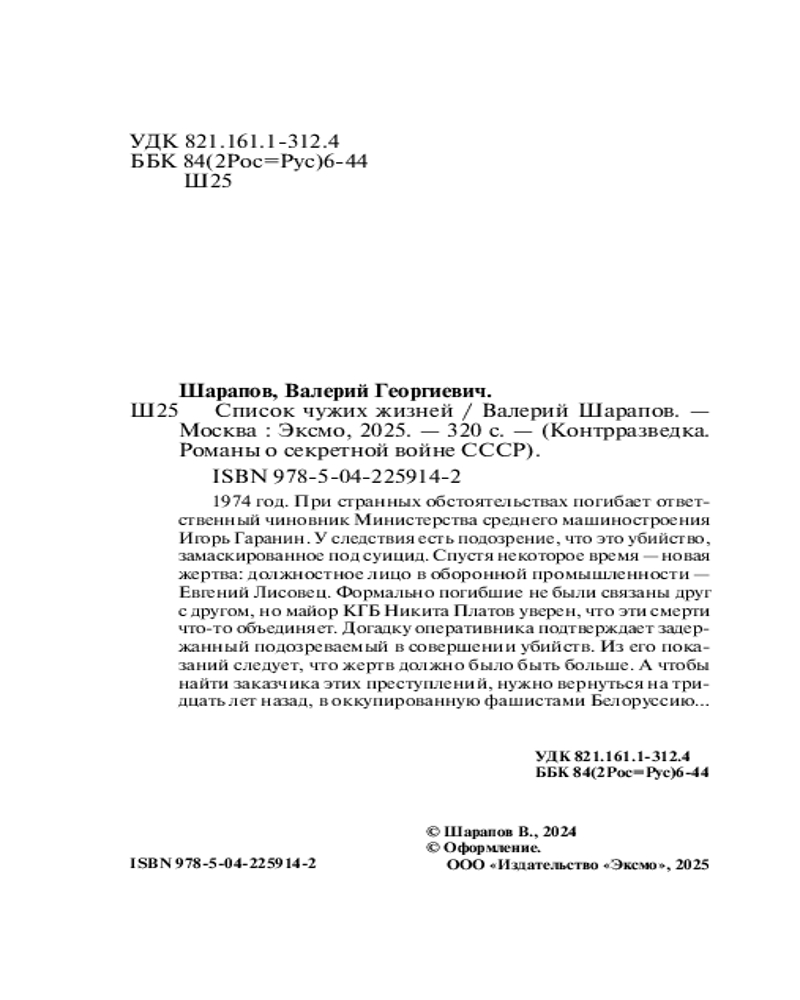 Серия: Контрразведка. Романы о секретной войне СССР (обложка) 1974 год. При странных обстоятельствах погибает ответственный чиновник Министерства среднего машиностроения Игорь Гаранин. У следствия есть подозрение, что это убийство, замаскированное под суицид. Спустя некоторое время — новая жертва: должностное лицо в оборонной промышленности — Евгений Лисовец. Формально погибшие не были связаны друг с другом, но майор КГБ Никита Платов уверен, что эти смерти что-то объединяет. Догадку оперативника подтверждает задержанный подозреваемый в совершении убийств. Из его показаний следует, что жертв должно было быть больше. А чтобы найти заказчика этих преступлений, нужно вернуться на тридцать лет назад, в оккупированную фашистами Белоруссию... |