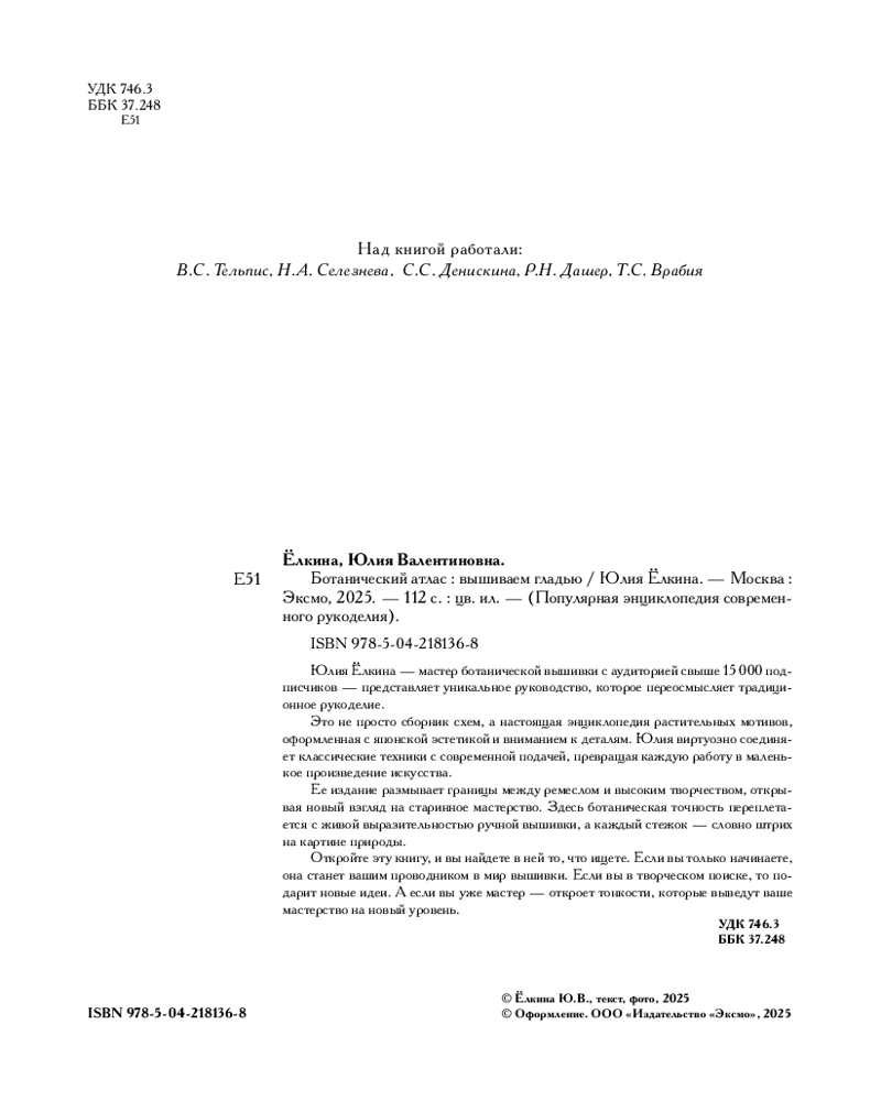 Серия: Популярная энциклопедия современного рукоделия Юлия Ёлкина, вышивальщица, блогер с 15-тысячной аудиторией, создала уникальное руководство по ботанической вышивке. Эта книга — настоящий визуальный шедевр, оформленный в элегантном японском стиле. В ней собраны стильные растительные мотивы, которые оживают на ткани благодаря подробным описаниям, схемам и пошаговым инструкциям. |